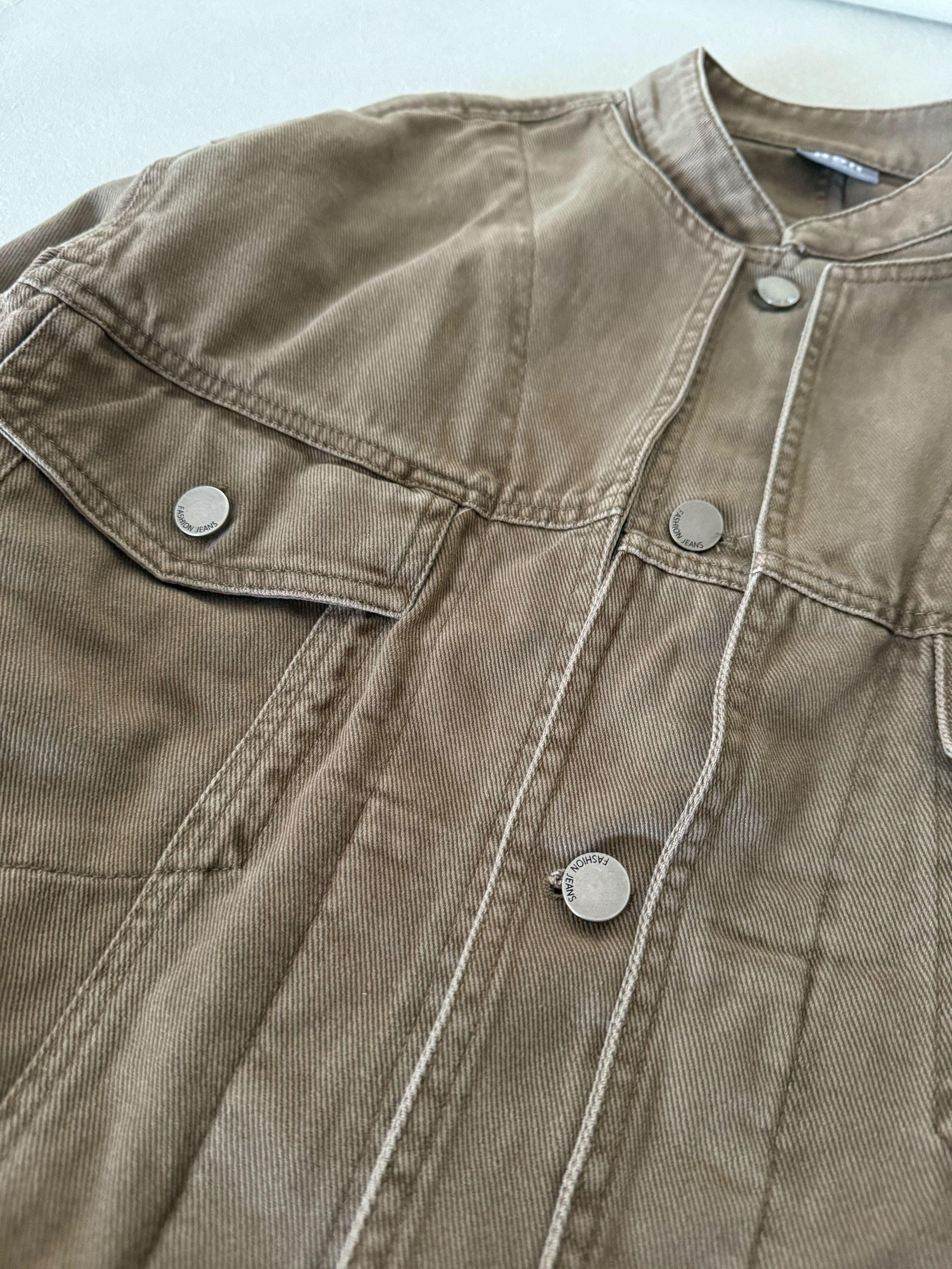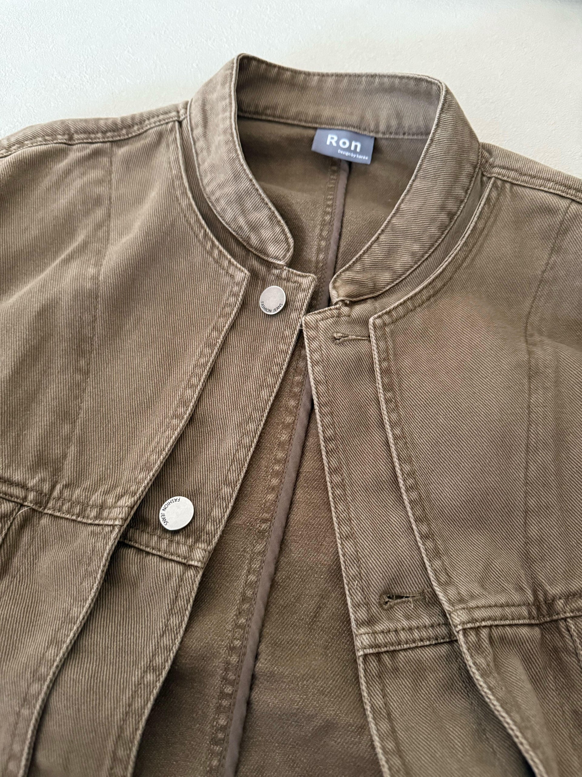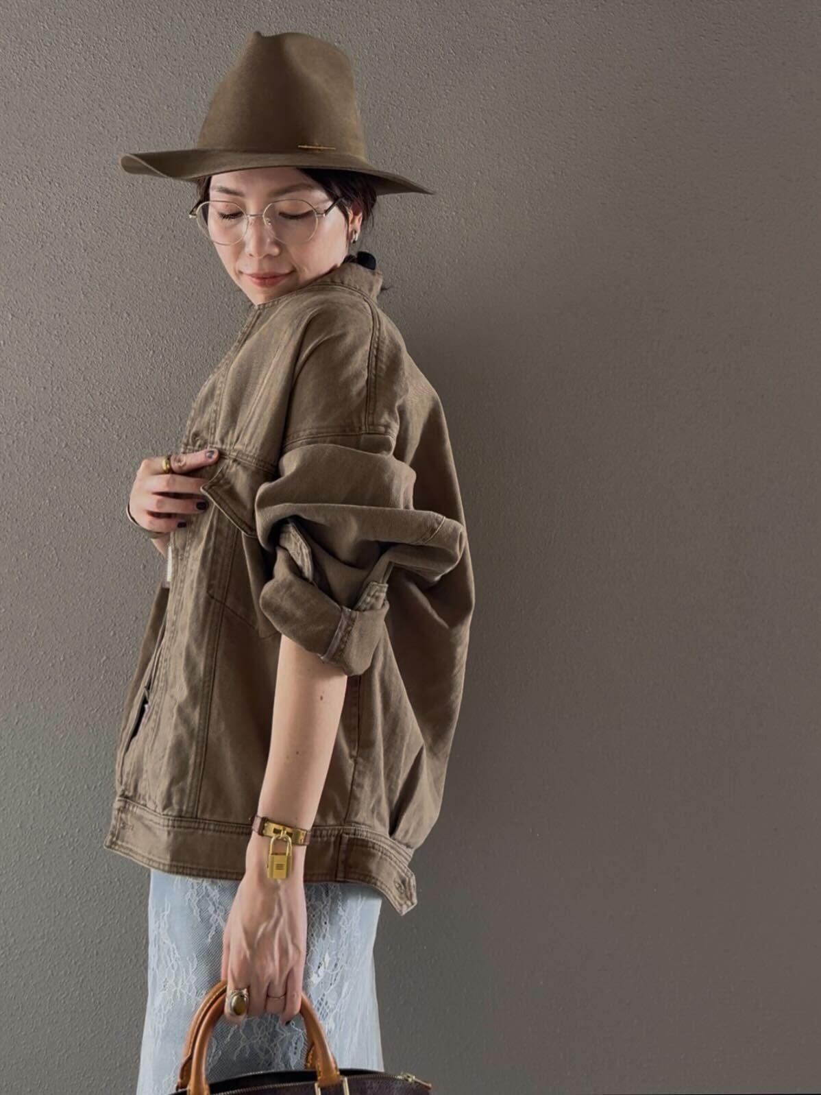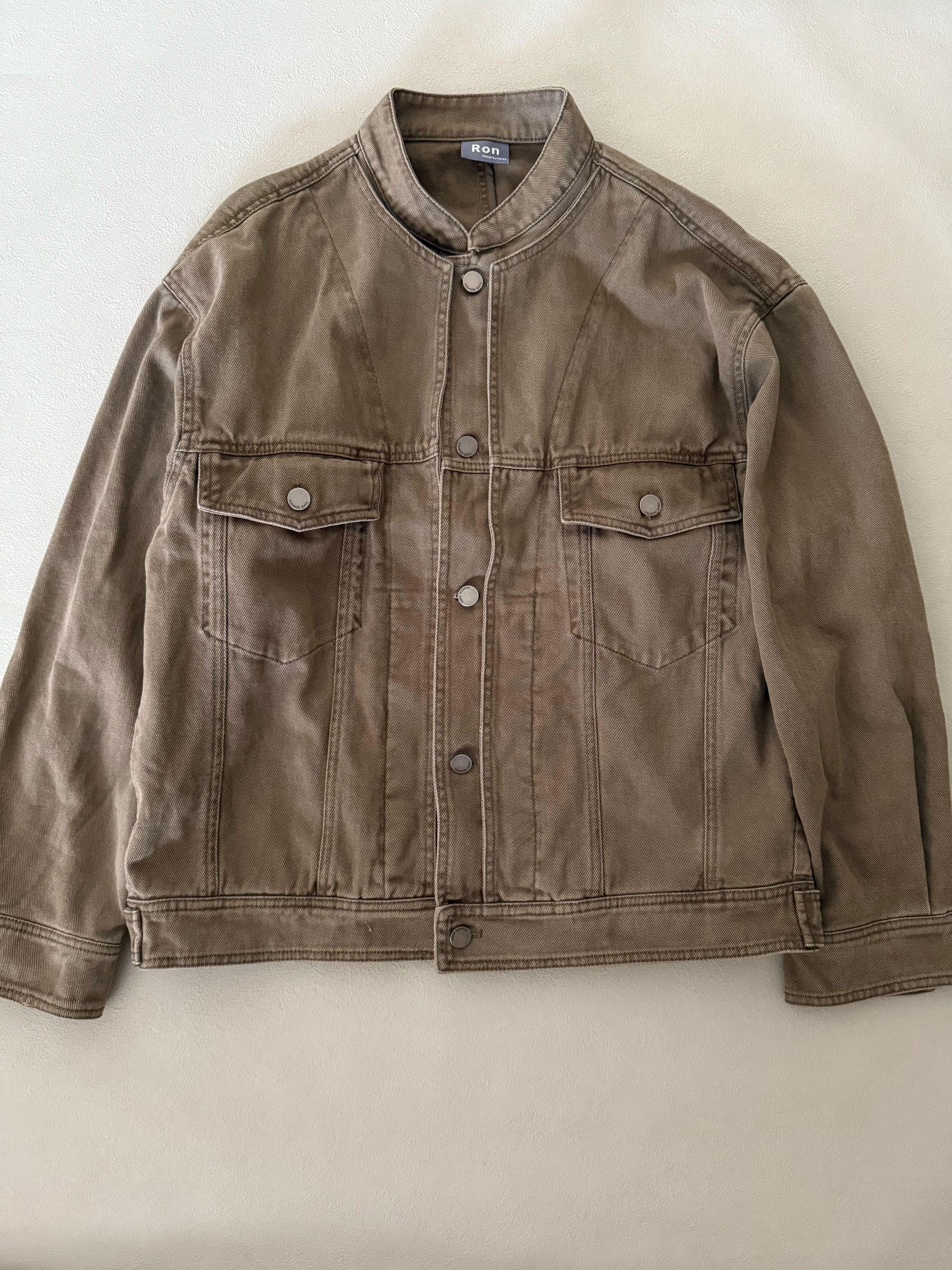 「デニム=ブルー」のイメージを覆す、深キャメルが目を惹くのノーカラーデニムジャケット。