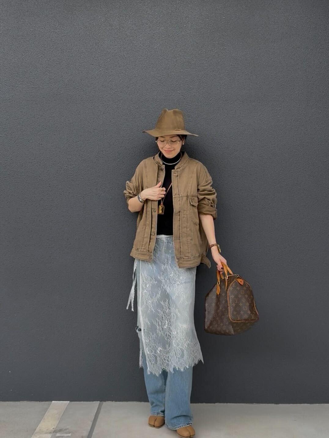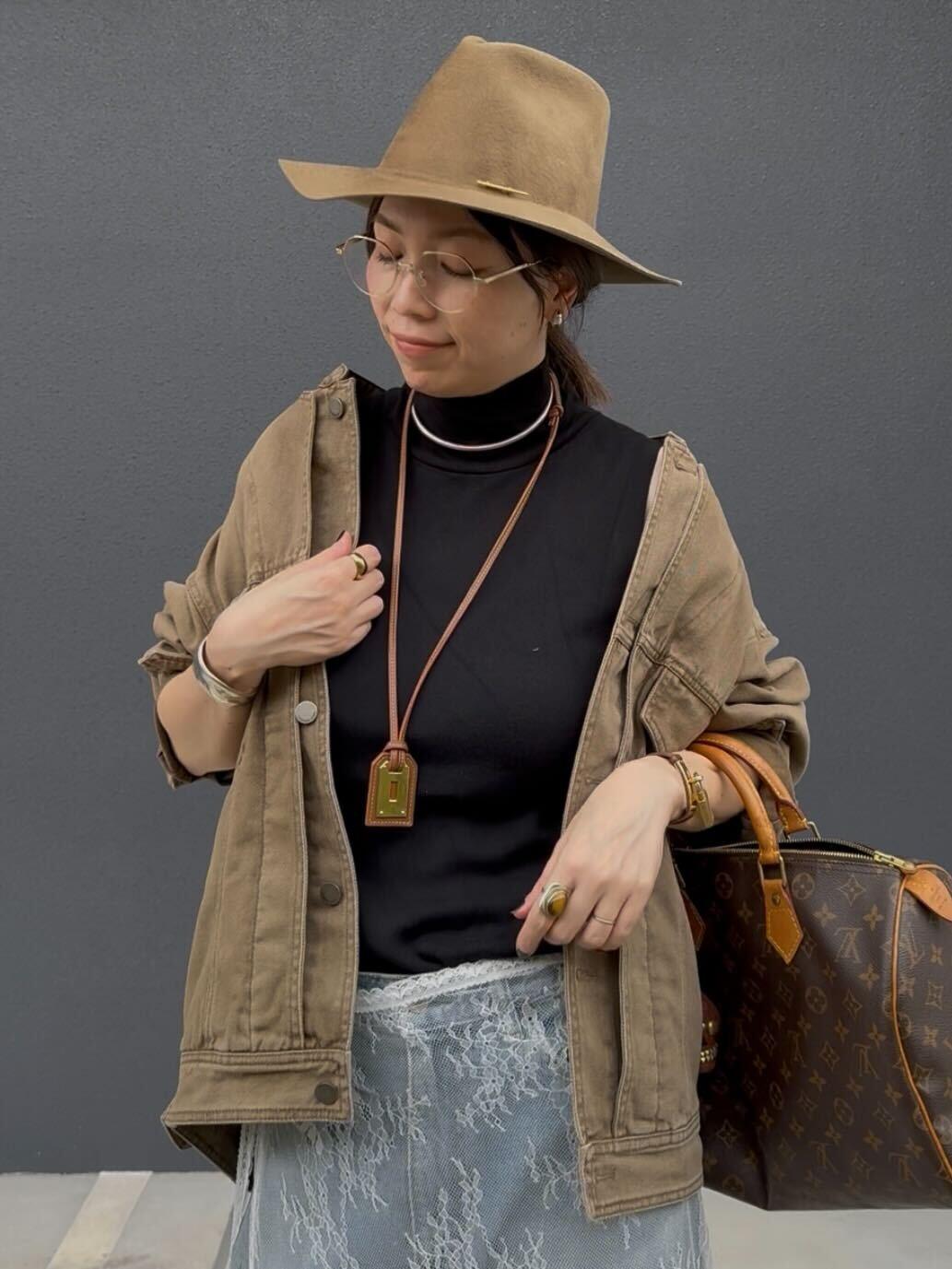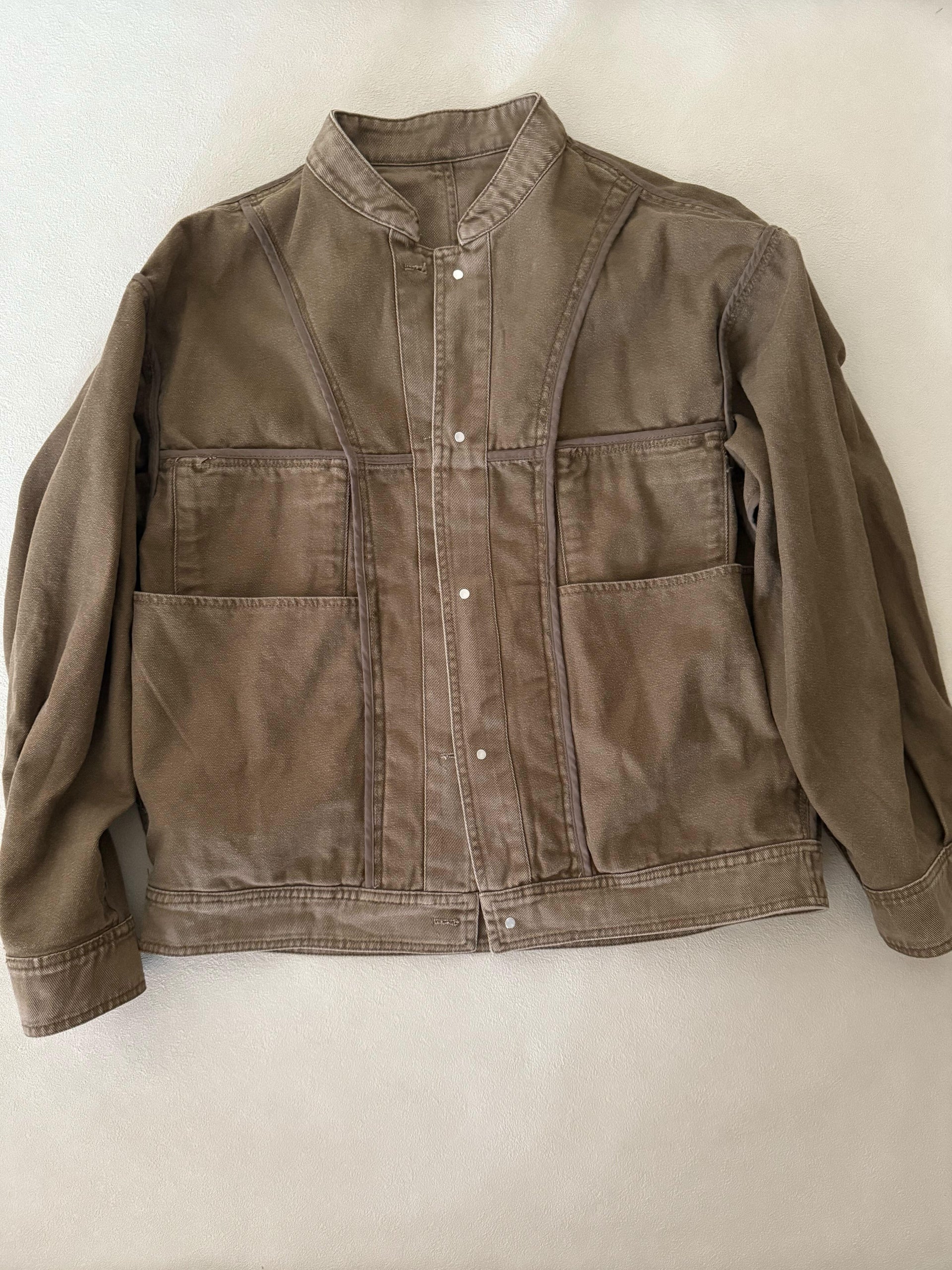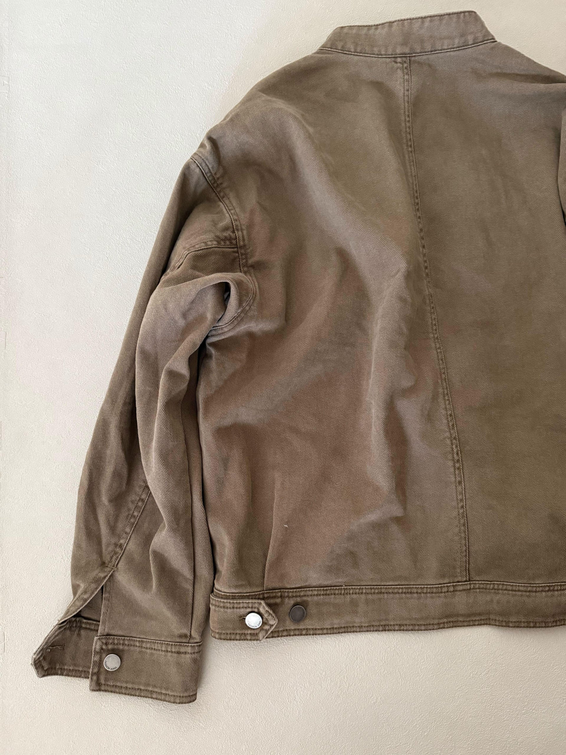 「デニム=ブルー」のイメージを覆す、深キャメルが目を惹くのノーカラーデニムジャケット。