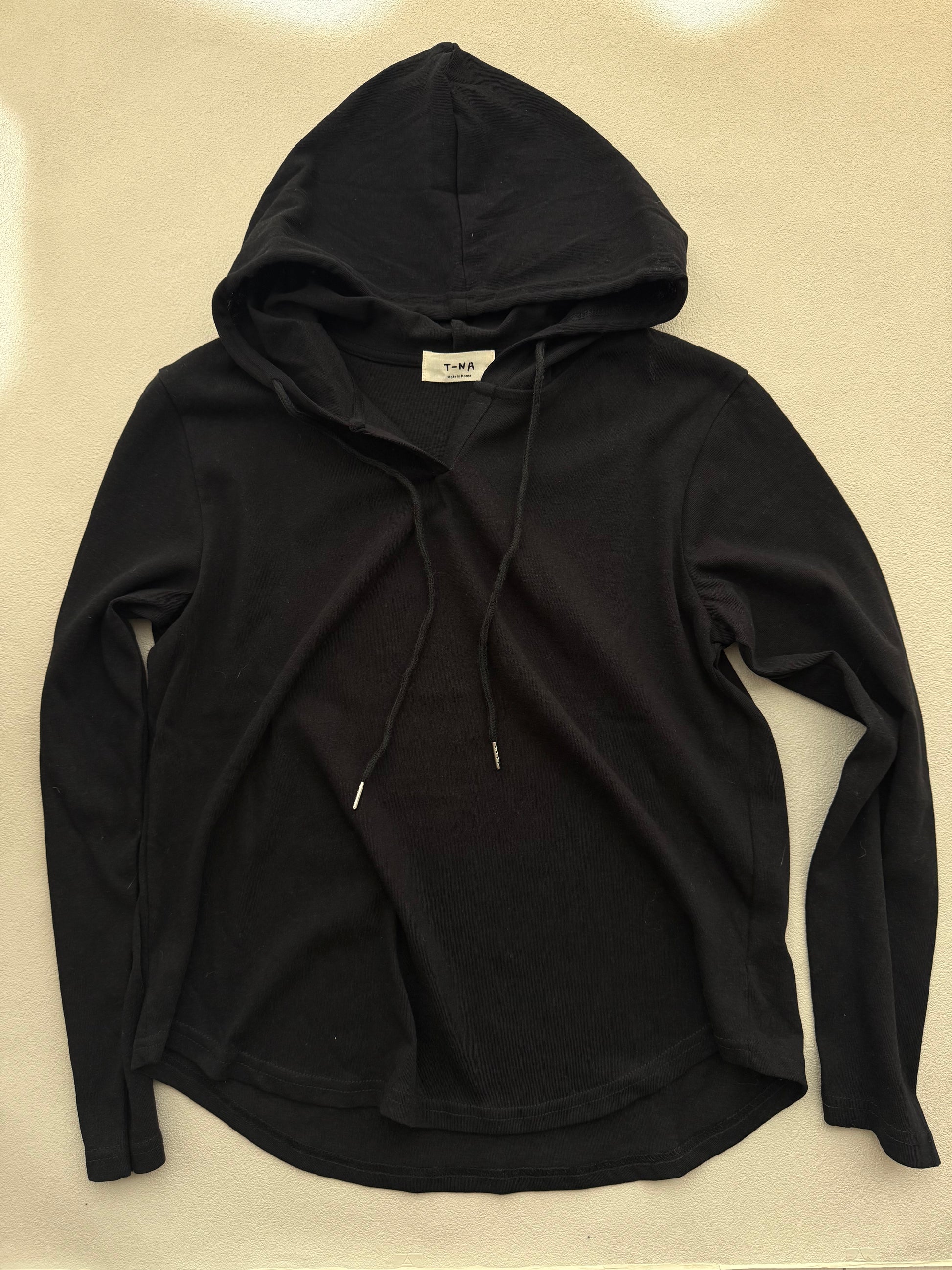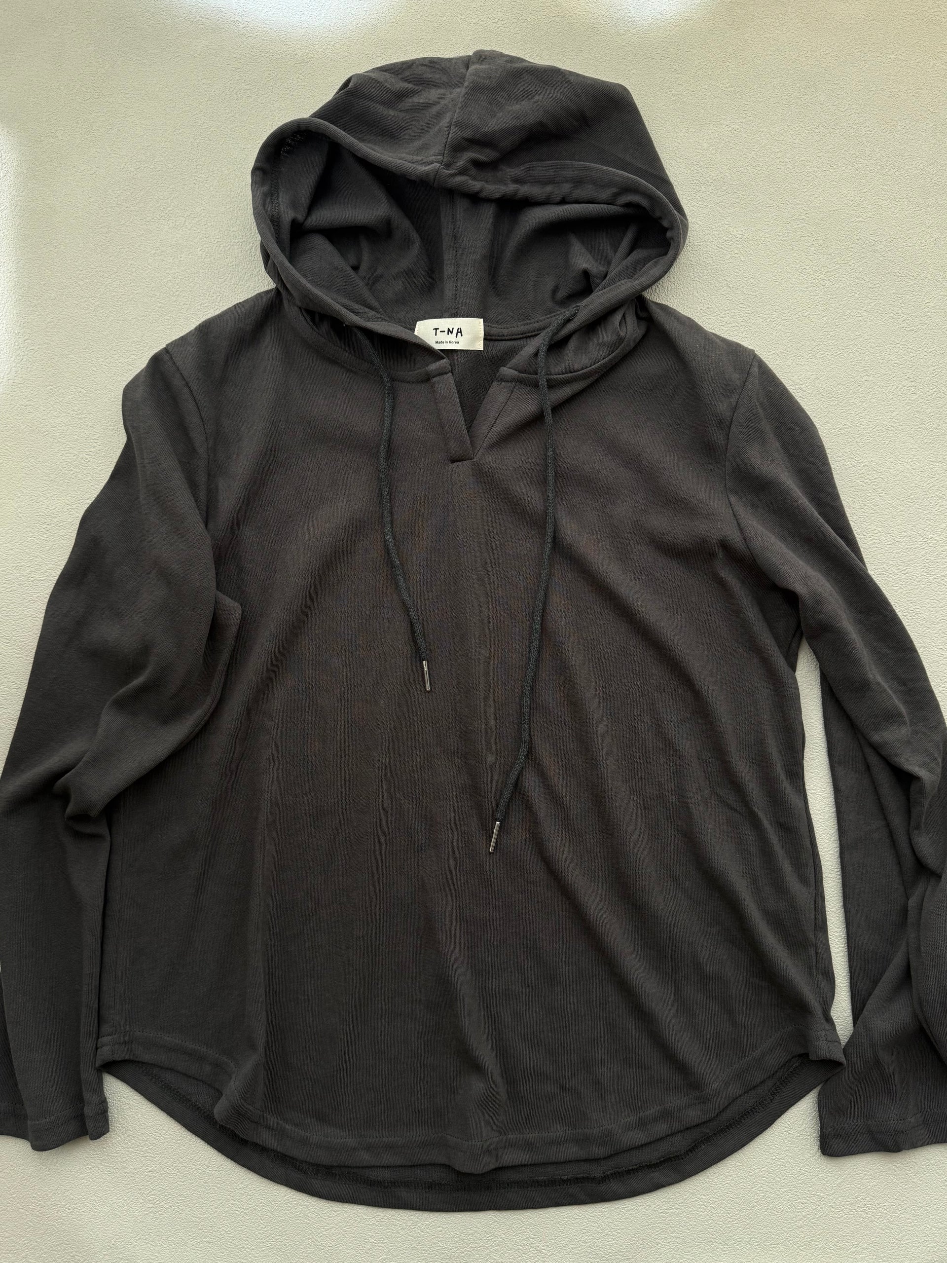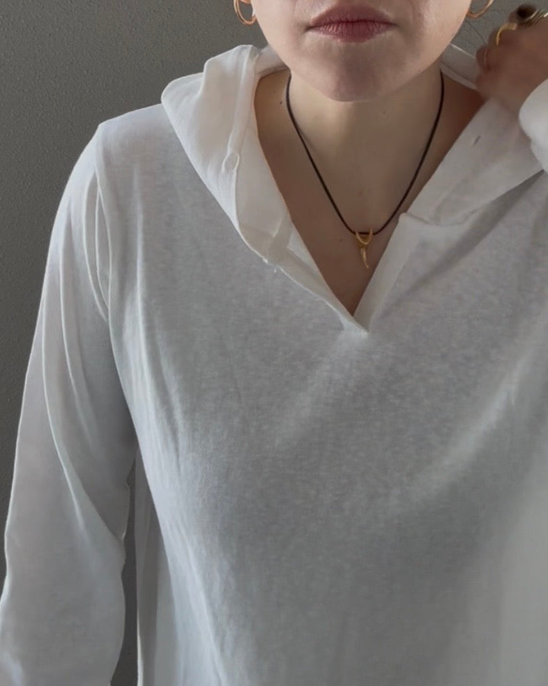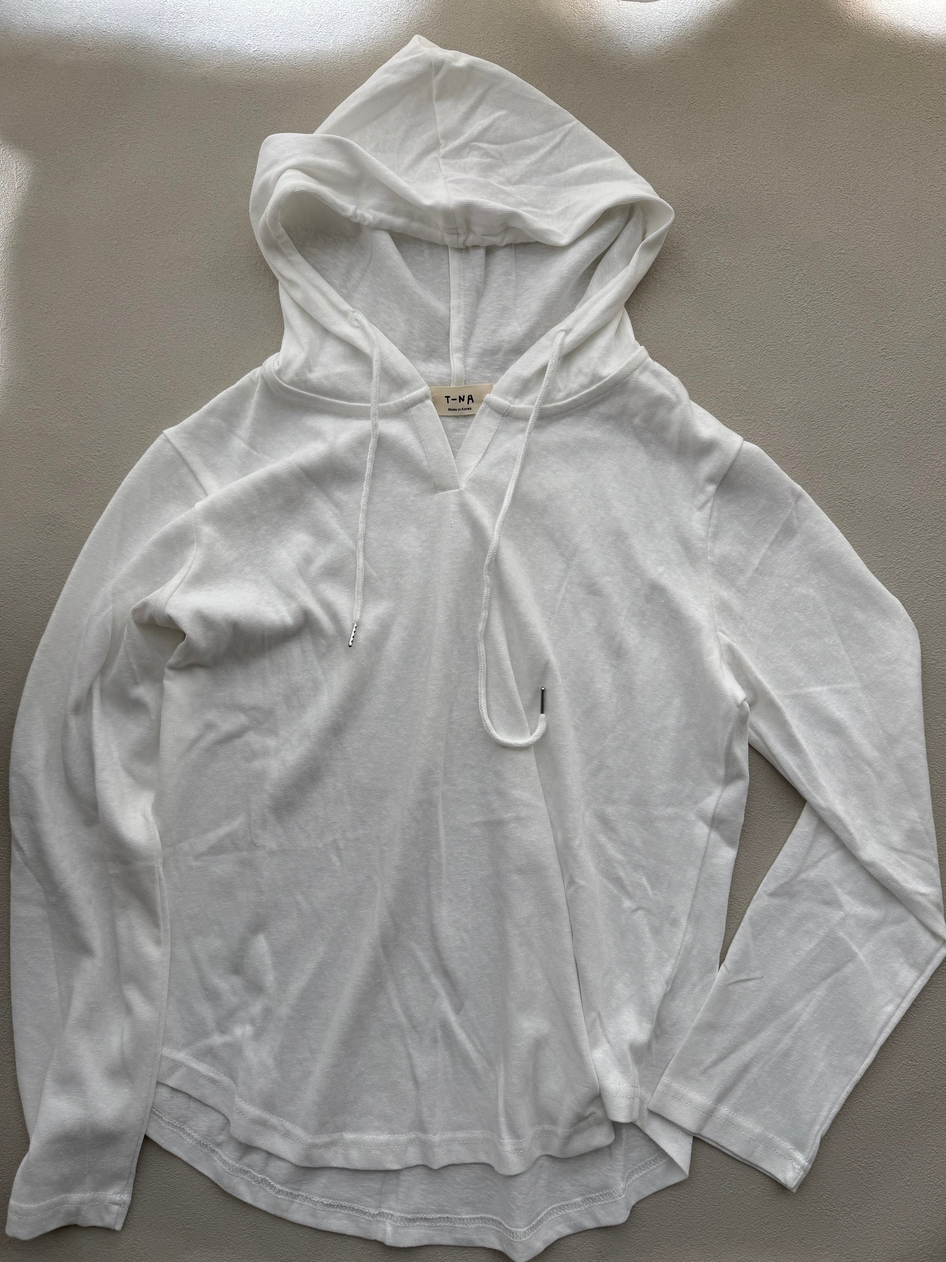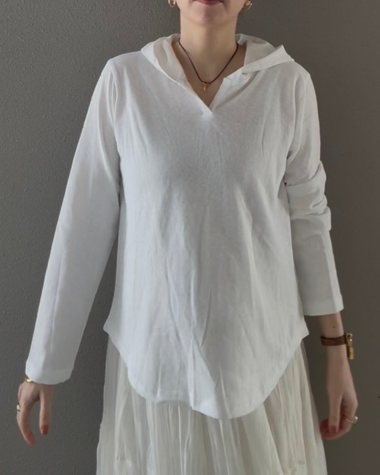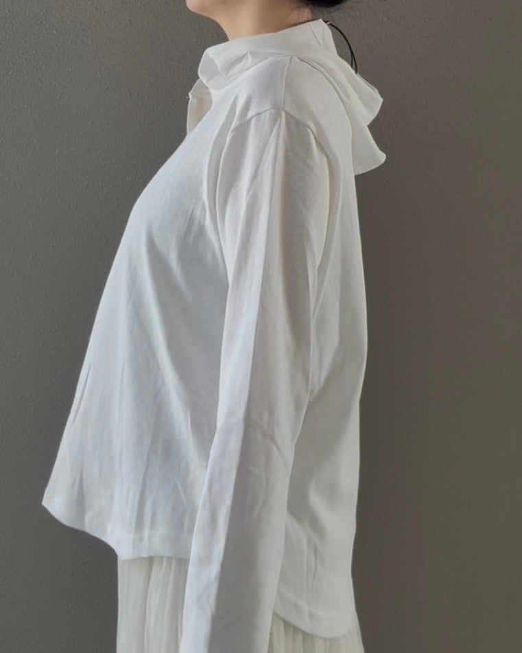 Tシャツの軽やかさに、フードの抜け感を添えた一枚。