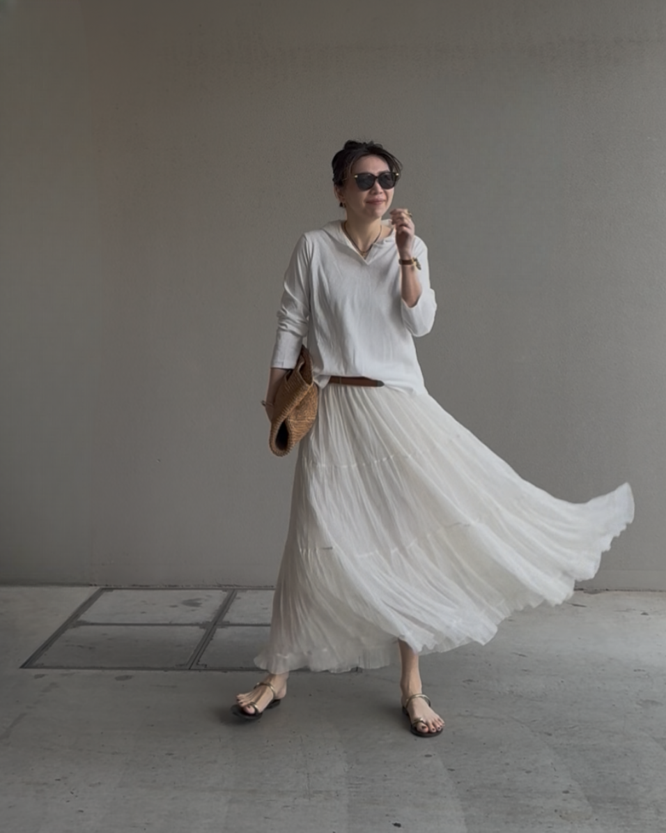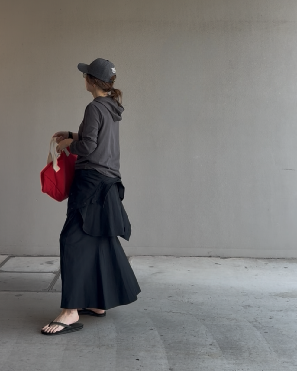 カジュアルなアイテムだからこそ、スカートやきれいめなボトムと合わせて