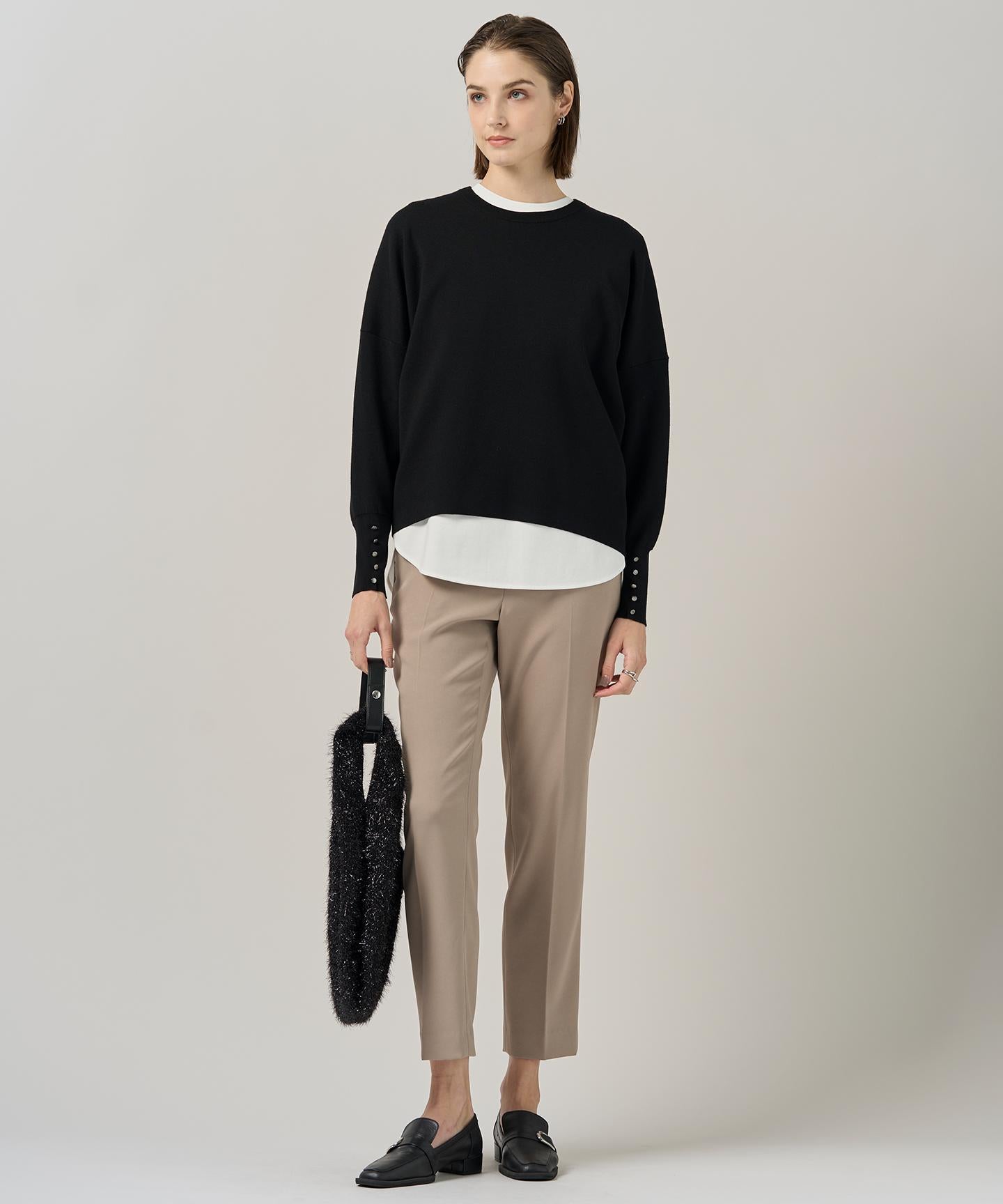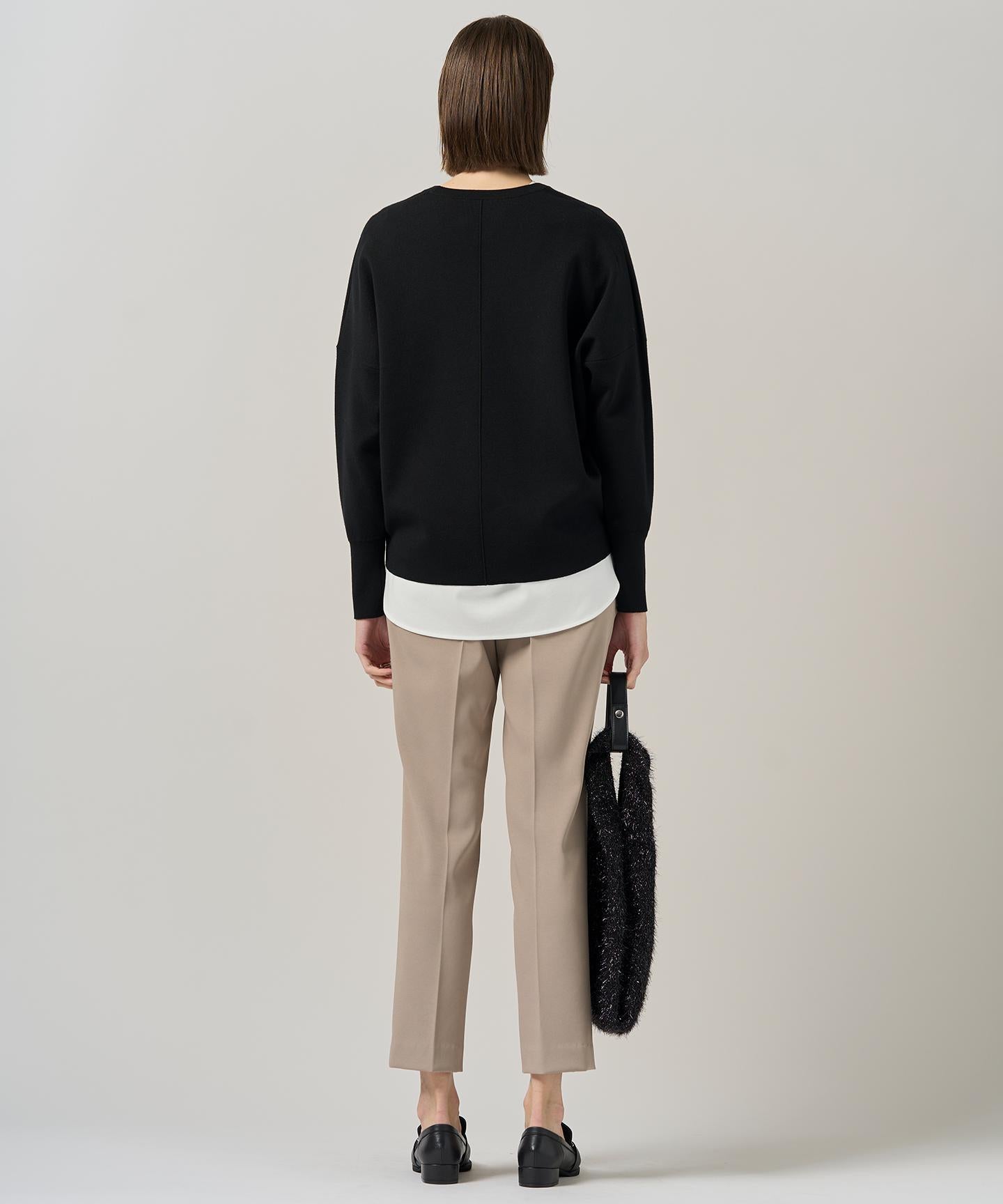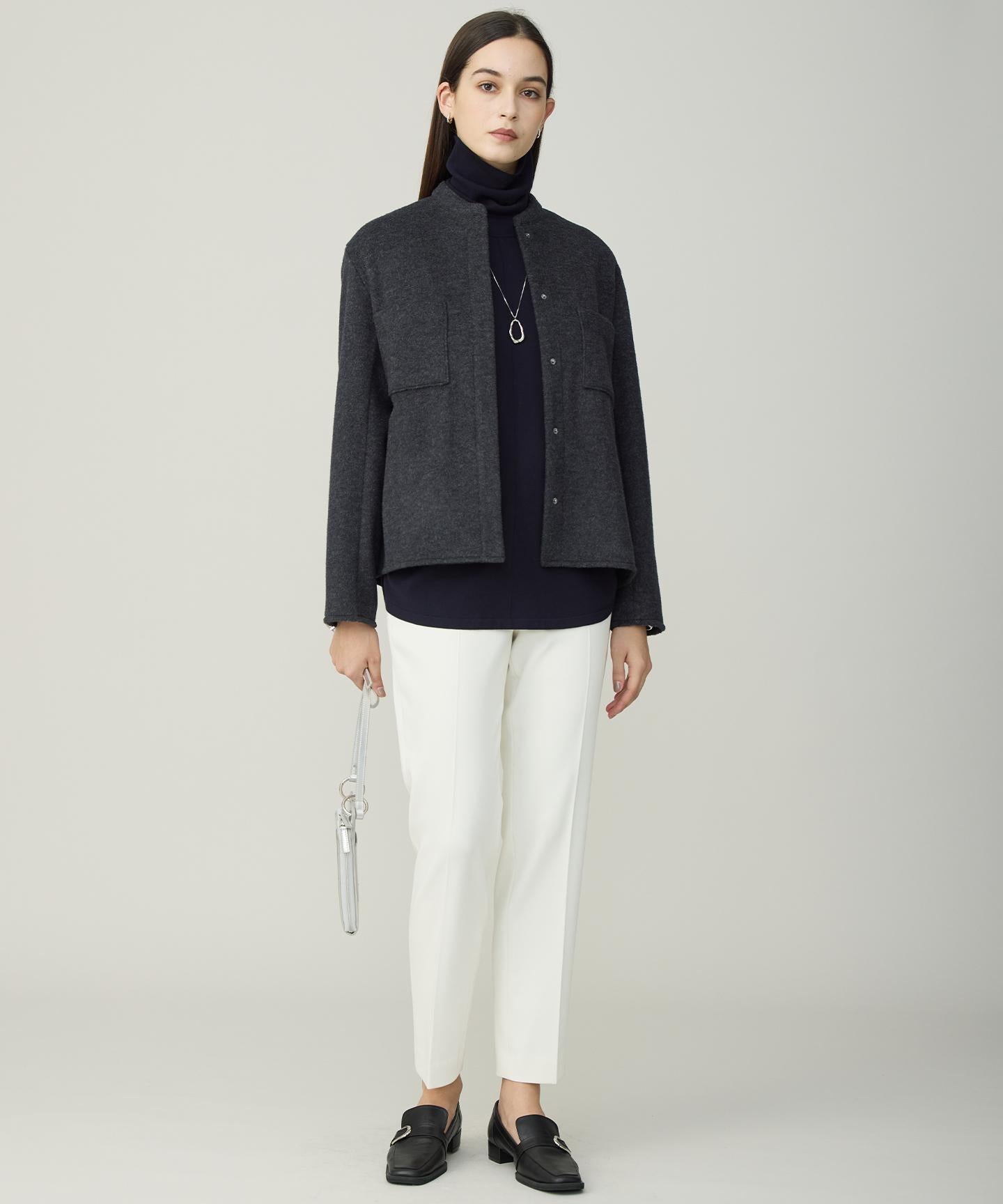 ■素材東レの透け防止タイプのポリエステルを使用した二重織ストレッチ素材です。トリアセテート混にしているため光沢と適度な落ち感があり、ソフトな着心地もこの素材の特徴です。裏起毛を施すことにより、温かく肌あたりの良いタッチを表現した素材に仕上げています。