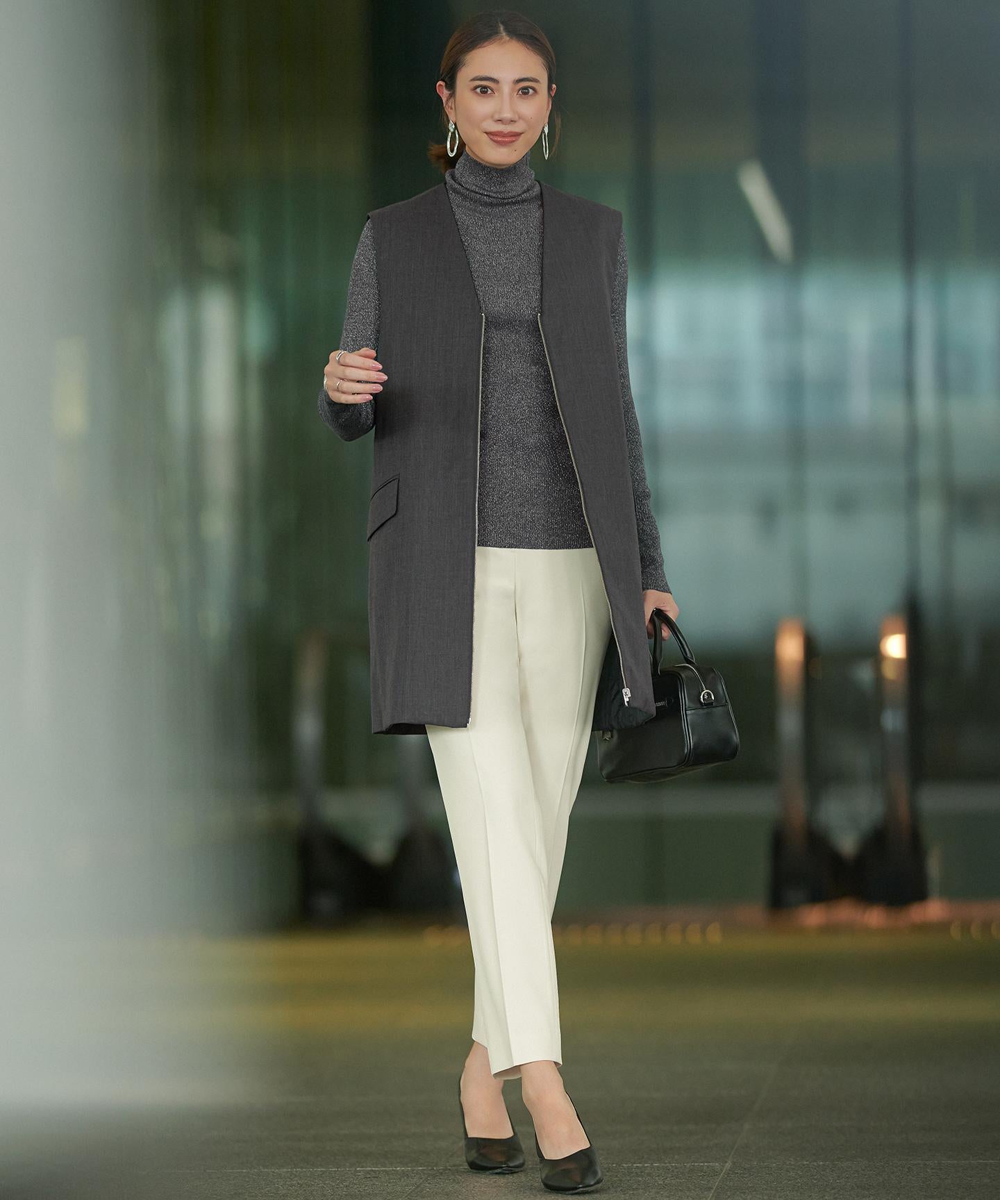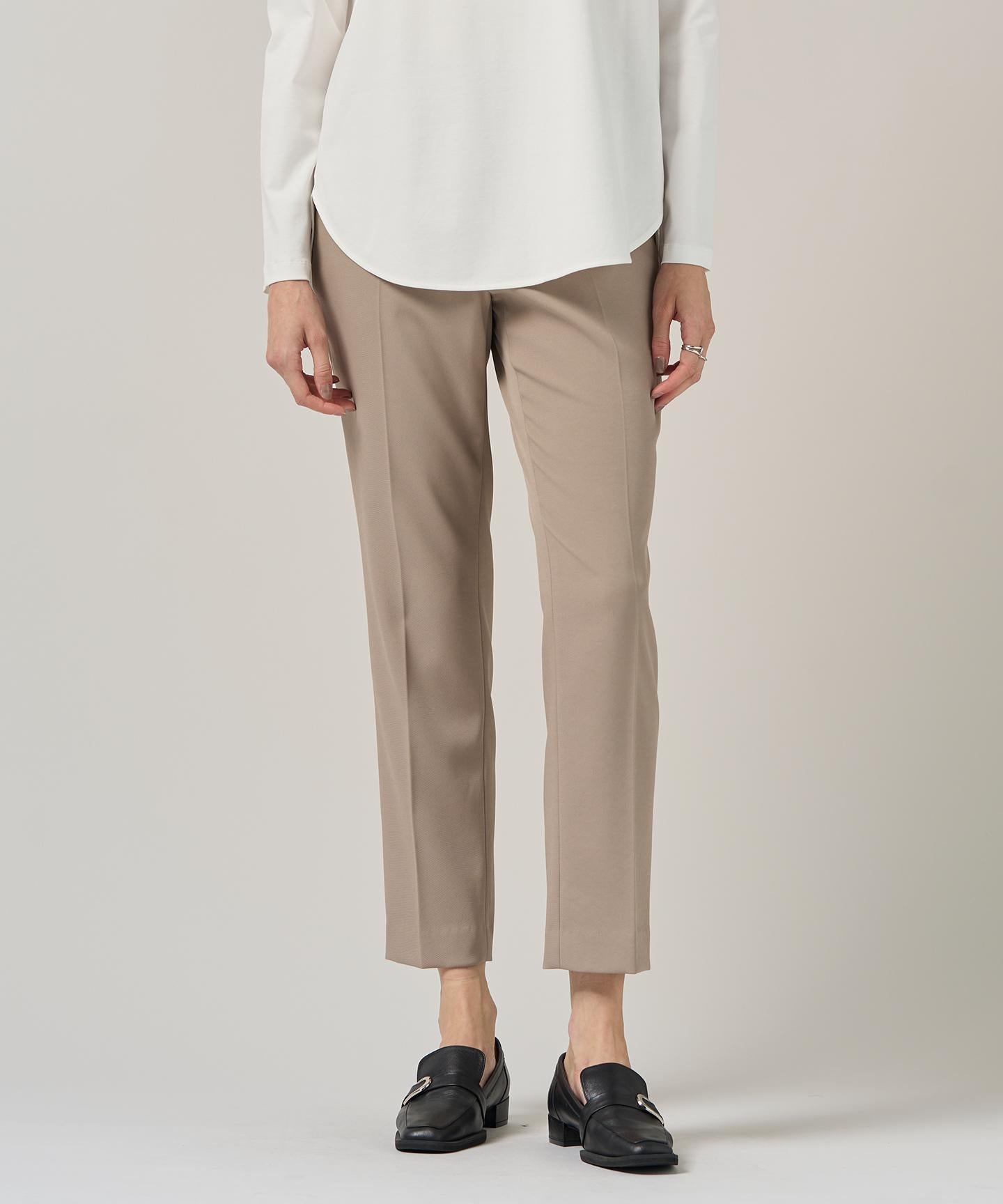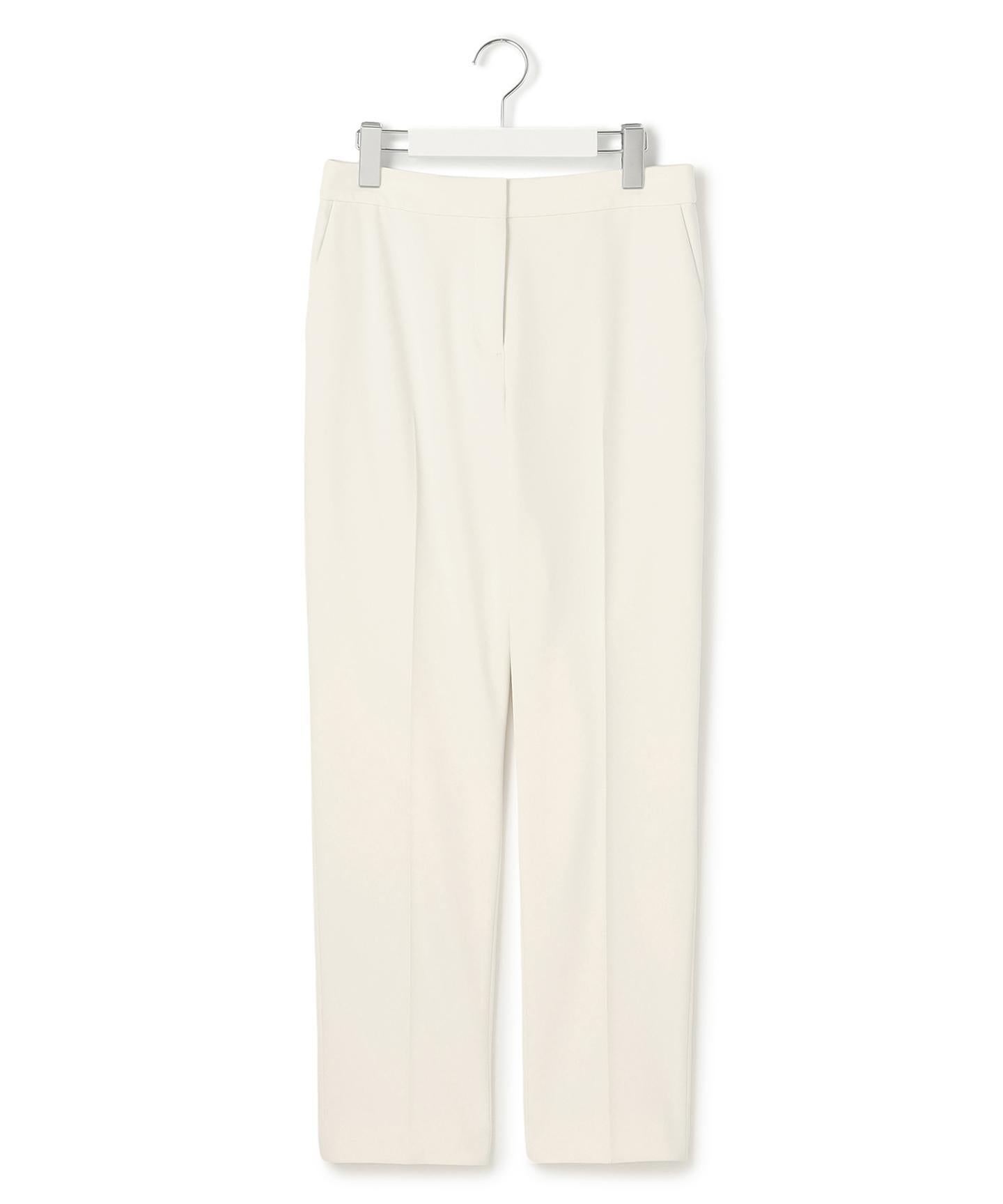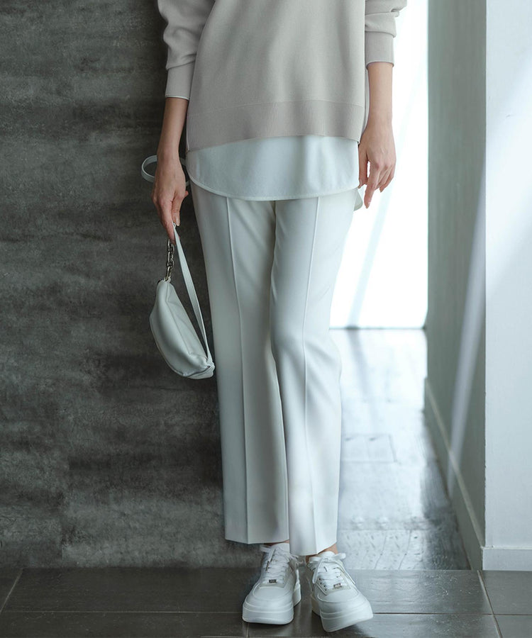 ■デザインキレイめで使いやすいスティックパンツです。センタープレス入りで、縦のラインが強調され、脚長効果や美脚効果も期待できます。ウエスト部分はゴム内蔵のスマートバック仕様で、ラクな履き心地なのも嬉しいポイント。トップスを選ばず、カジュアルからビジネスまで幅広いシーンで活躍する万能アイテムです。オフホワイトのみパワーネットを使用し、透けにくい仕様にしています。