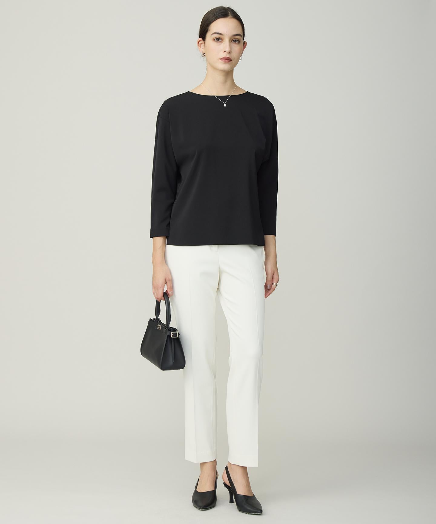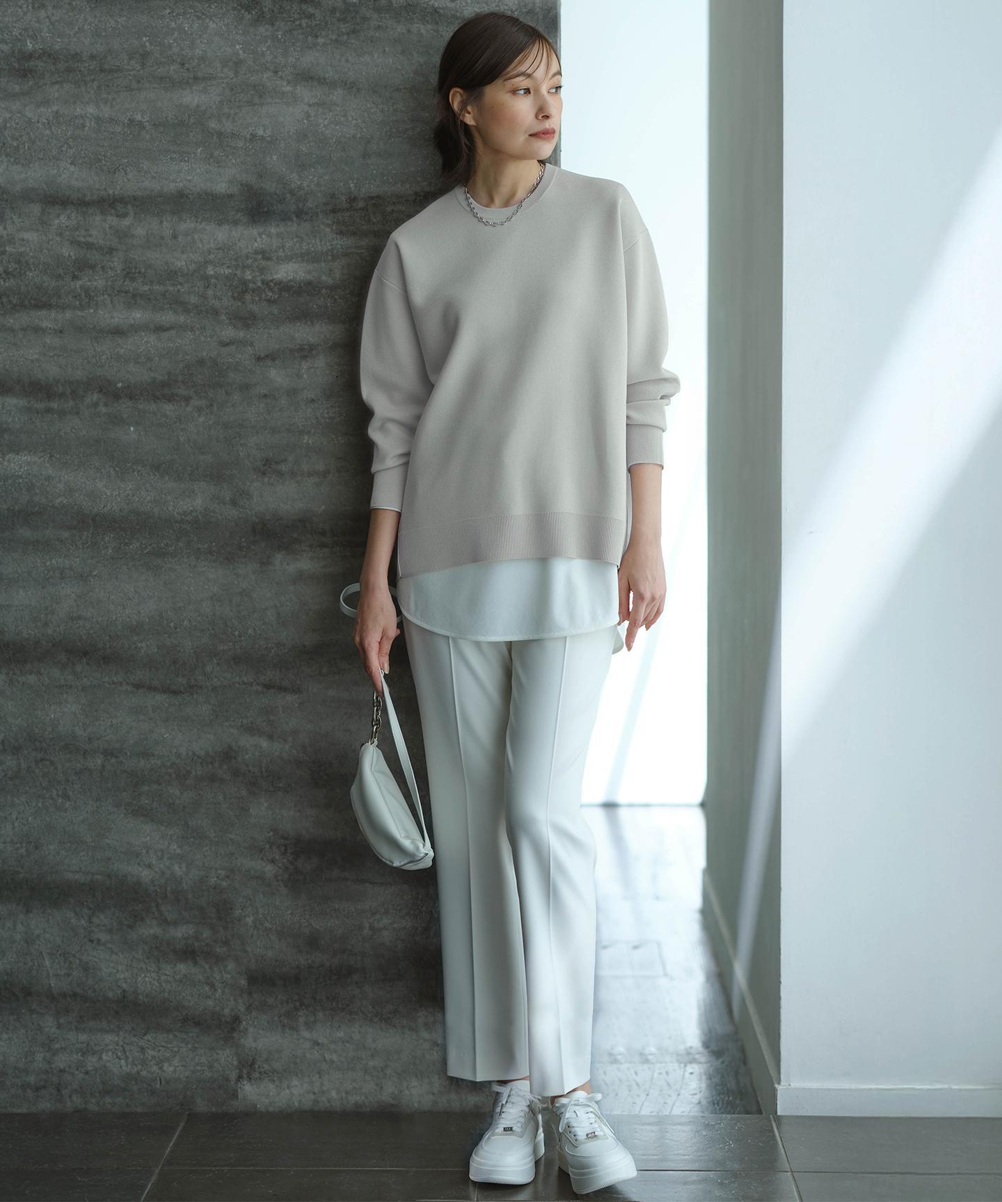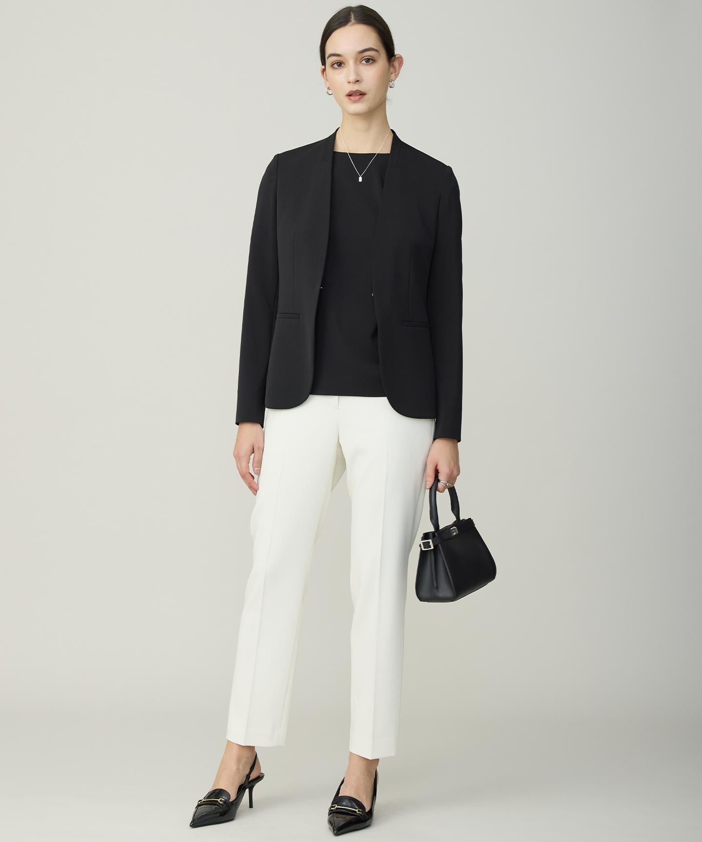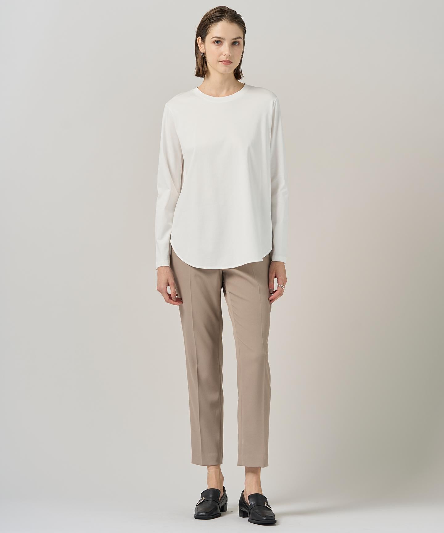 ■デザインキレイめで使いやすいスティックパンツです。センタープレス入りで、縦のラインが強調され、脚長効果や美脚効果も期待できます。ウエスト部分はゴム内蔵のスマートバック仕様で、ラクな履き心地なのも嬉しいポイント。トップスを選ばず、カジュアルからビジネスまで幅広いシーンで活躍する万能アイテムです。オフホワイトのみパワーネットを使用し、透けにくい仕様にしています。