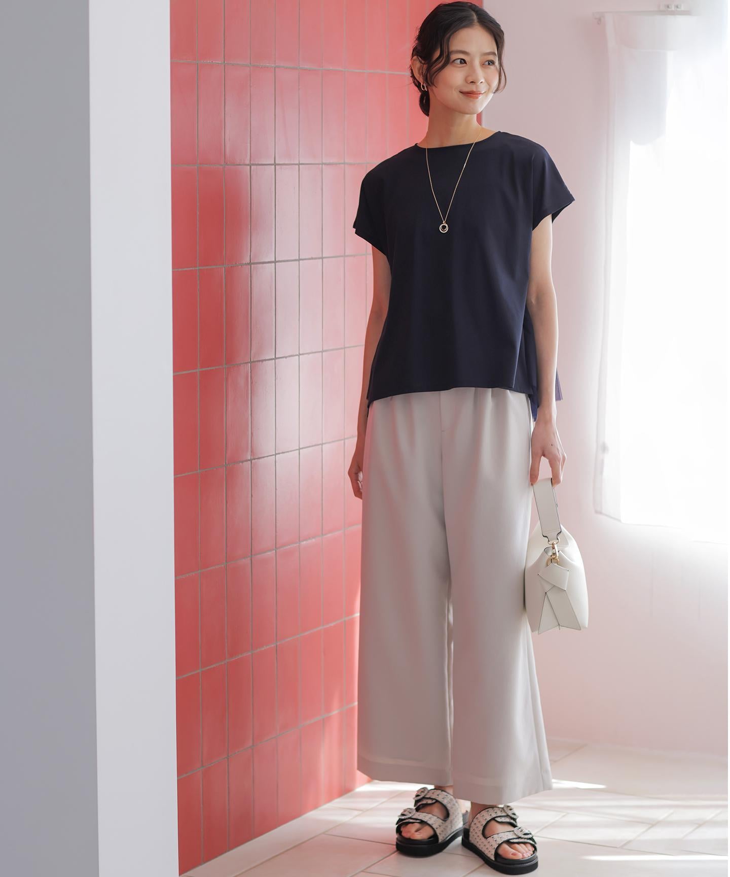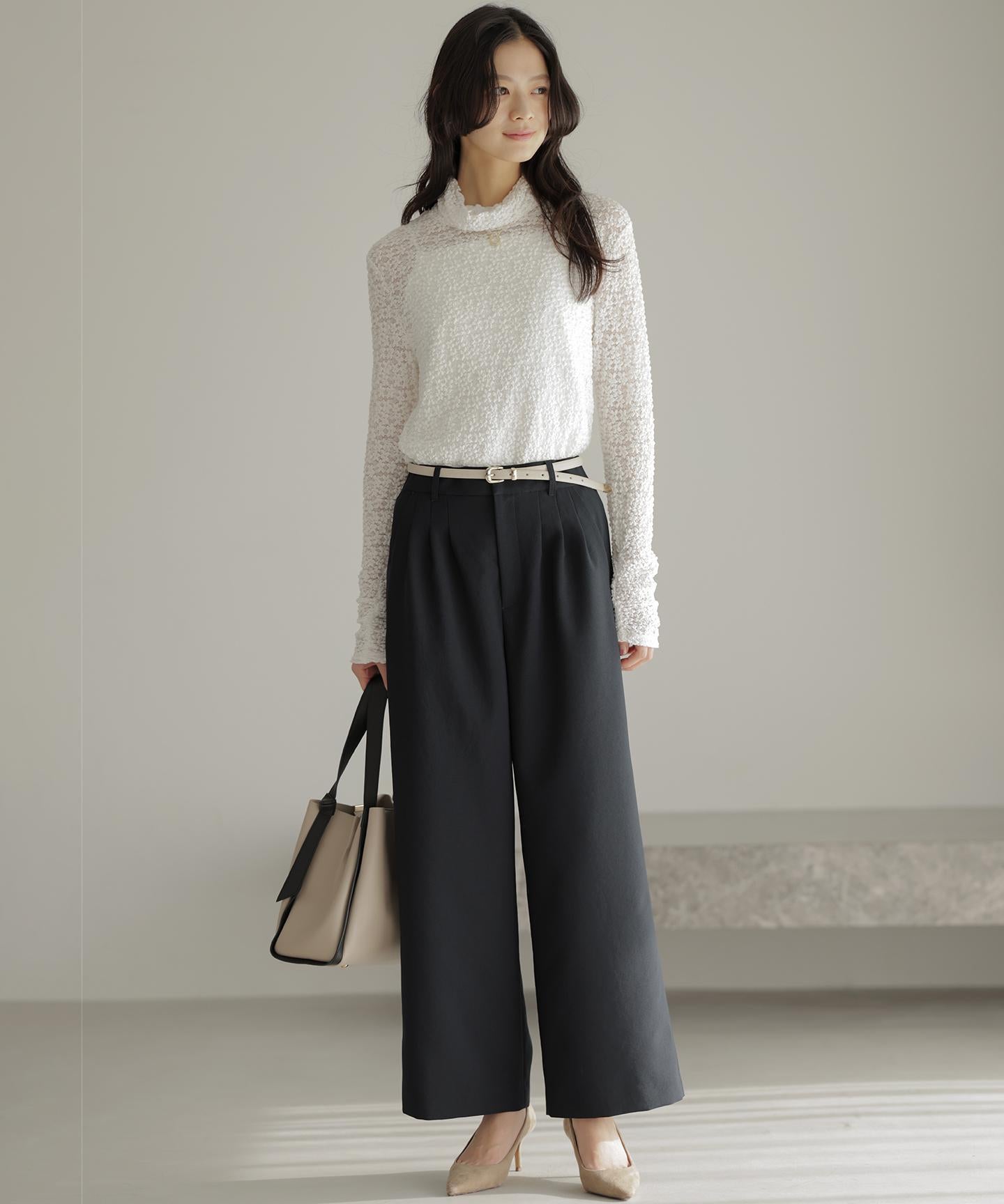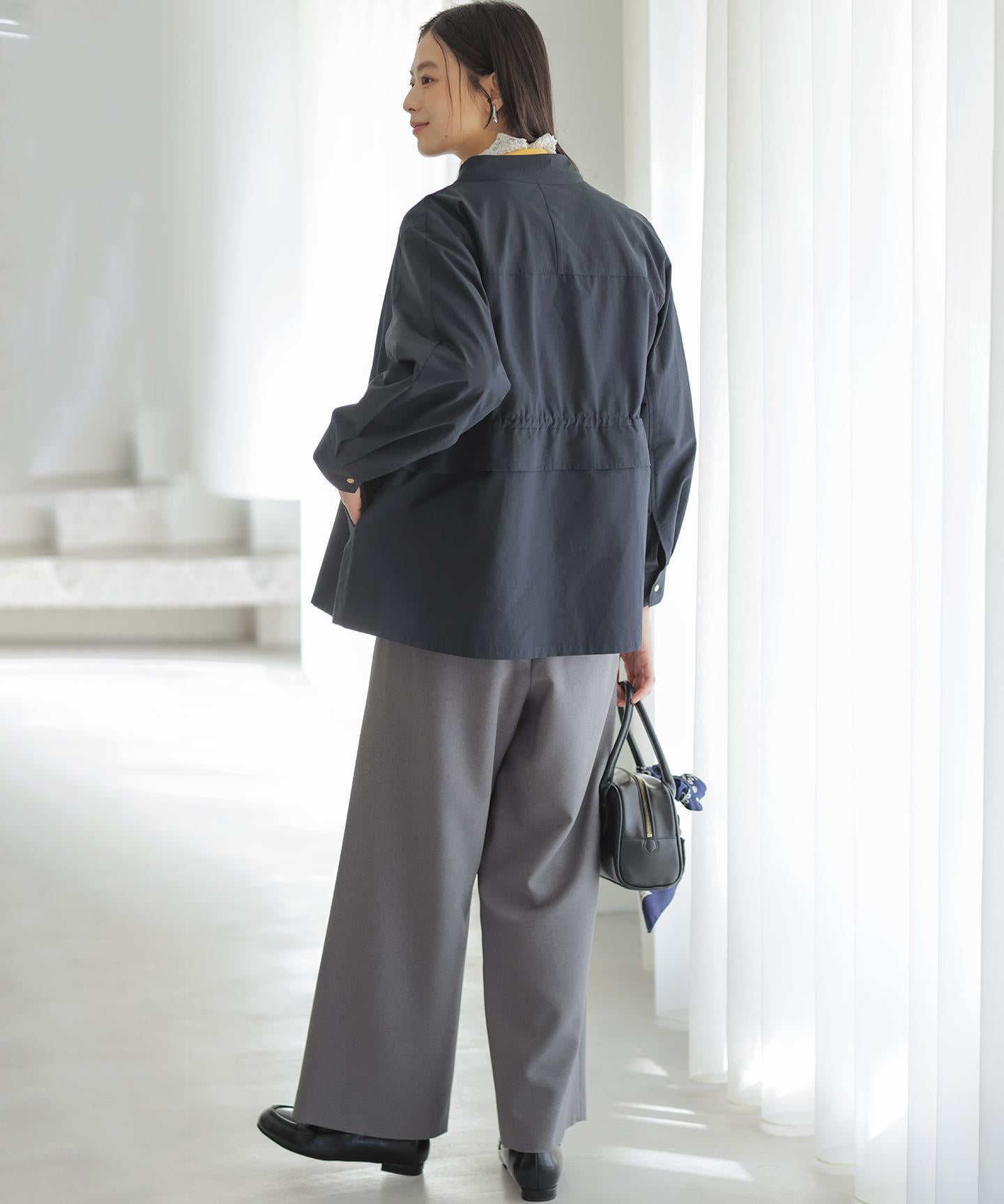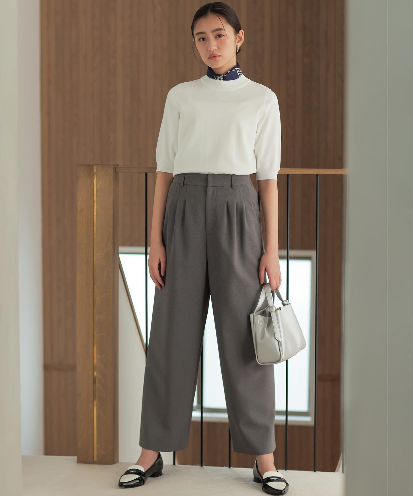 ■デザイン・フロントに入る3本のタックで、立体感のある自然なラインを演出。・後ろのゴムは特殊な刺繍ステッチでまるでリブの様な仕上がりでボトムスをインした時にもデザインポイントになります。・オフィスカジュアルにもデイリーにも活躍する万能アイテムです。・#002サンドベージュ系 総裏 #003グレー系・075ネイビー系 裏なし
