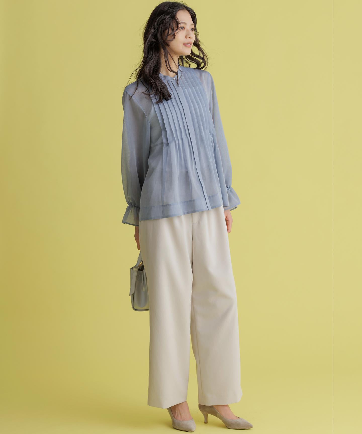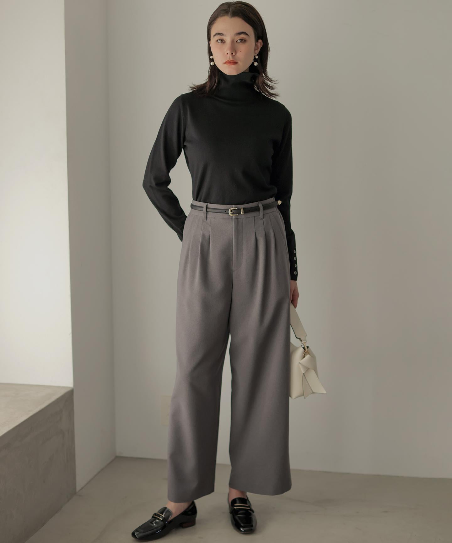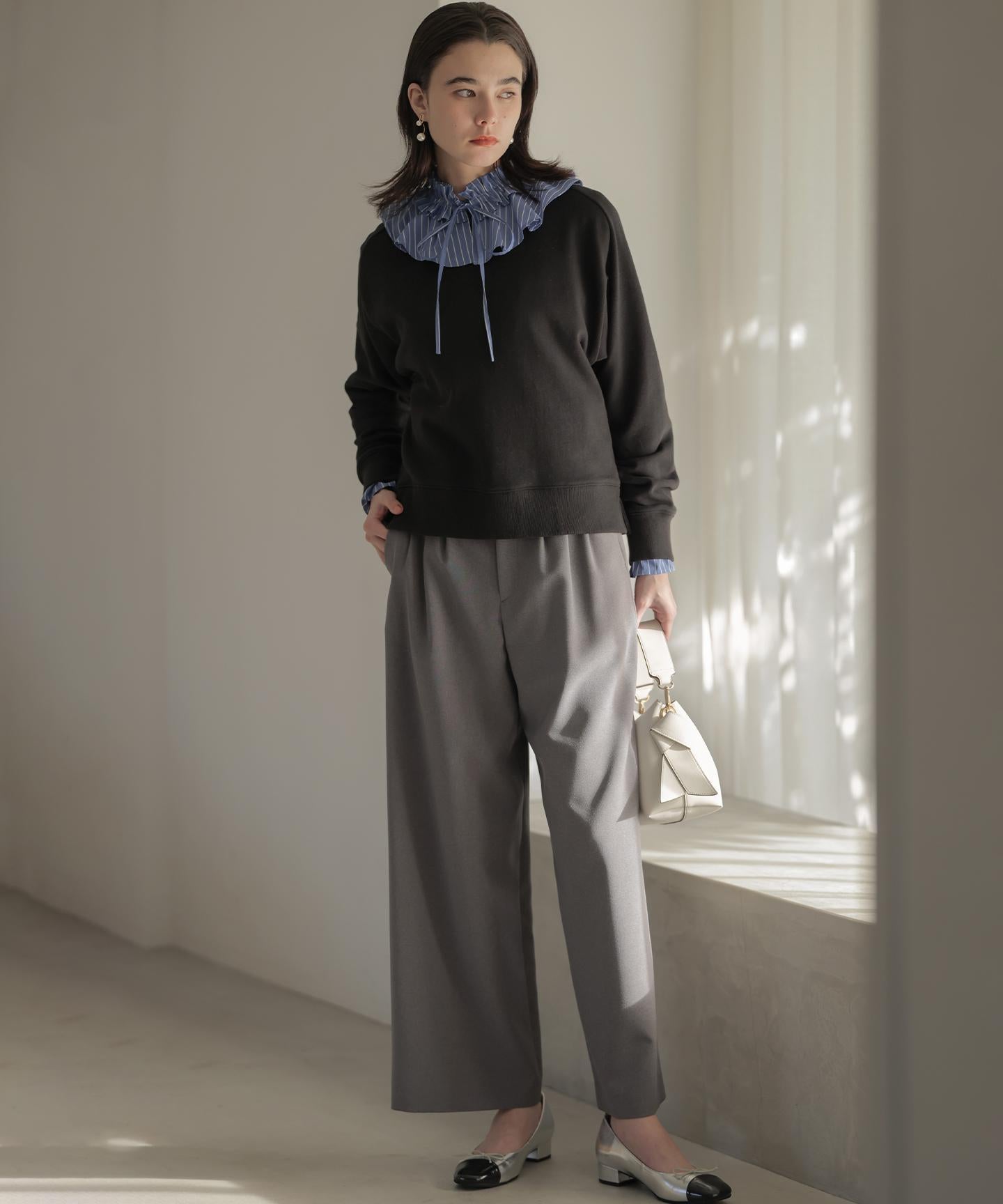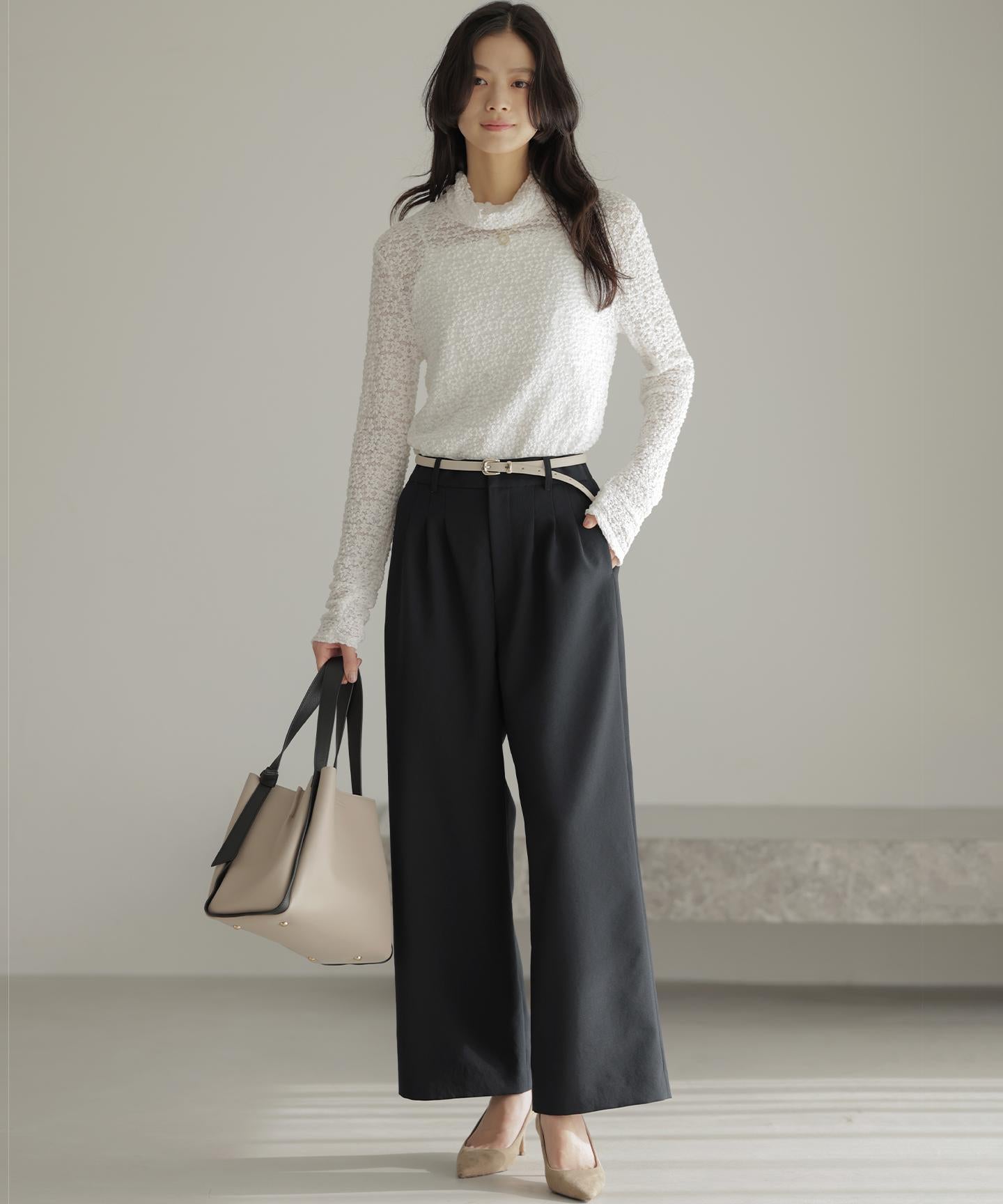 ■デザイン・フロントに入る3本のタックで、立体感のある自然なラインを演出。・後ろのゴムは特殊な刺繍ステッチでまるでリブの様な仕上がりでボトムスをインした時にもデザインポイントになります。・オフィスカジュアルにもデイリーにも活躍する万能アイテムです。・#002サンドベージュ系 総裏 #003グレー系・075ネイビー系 裏なし