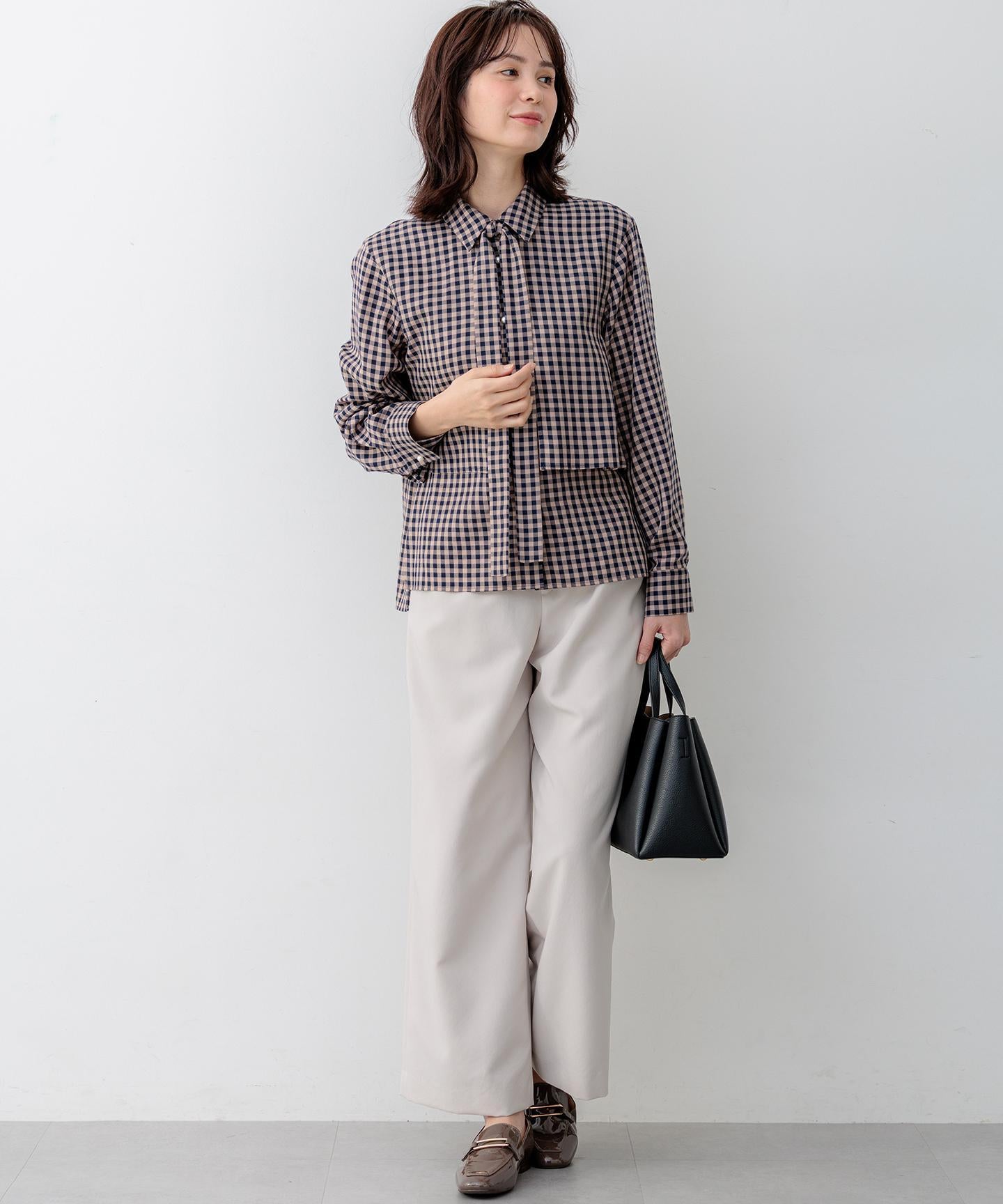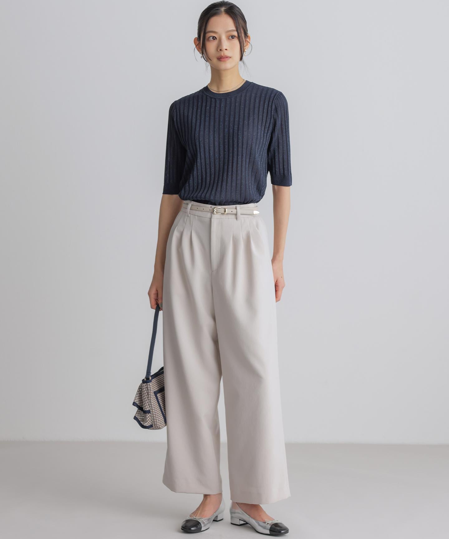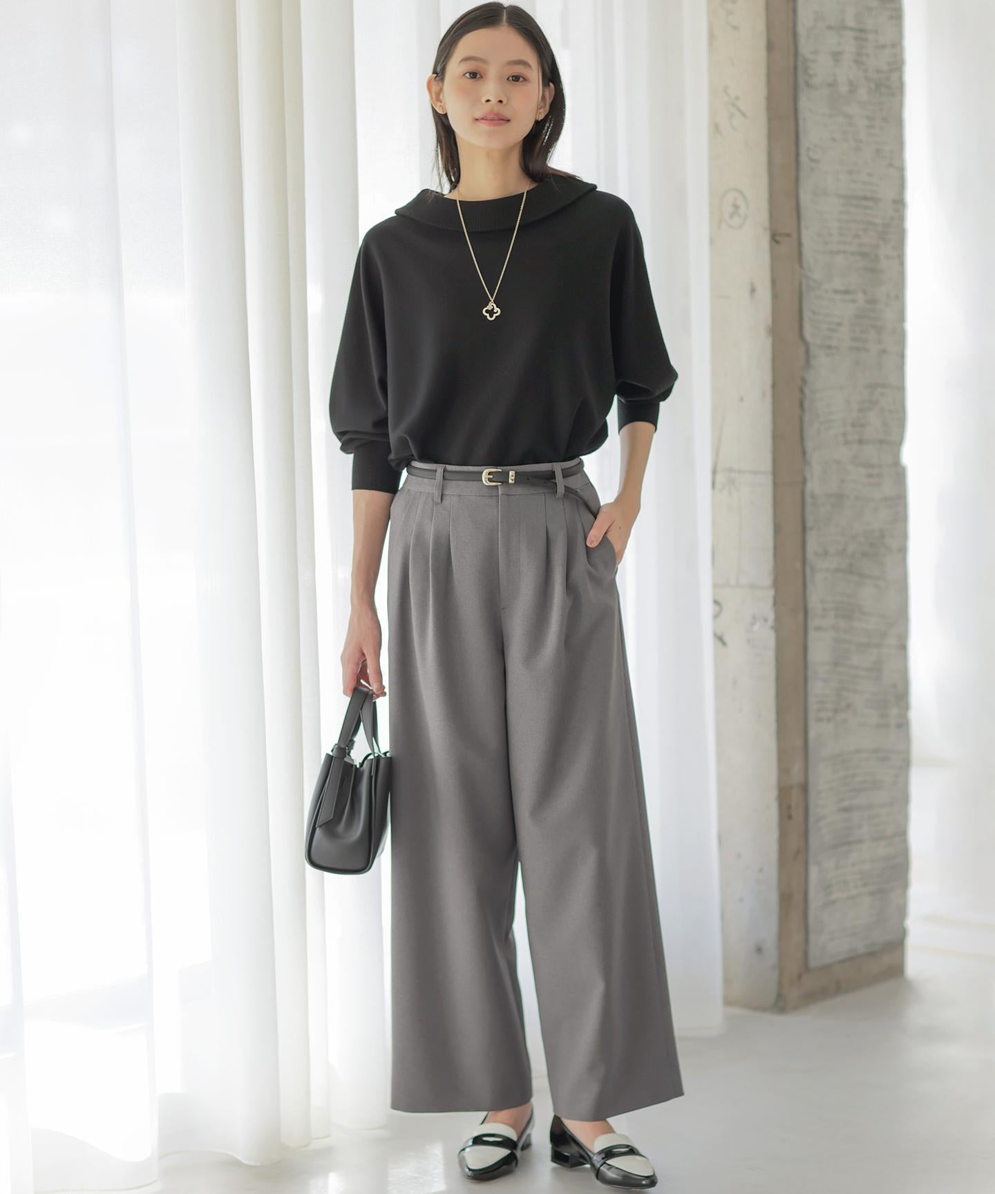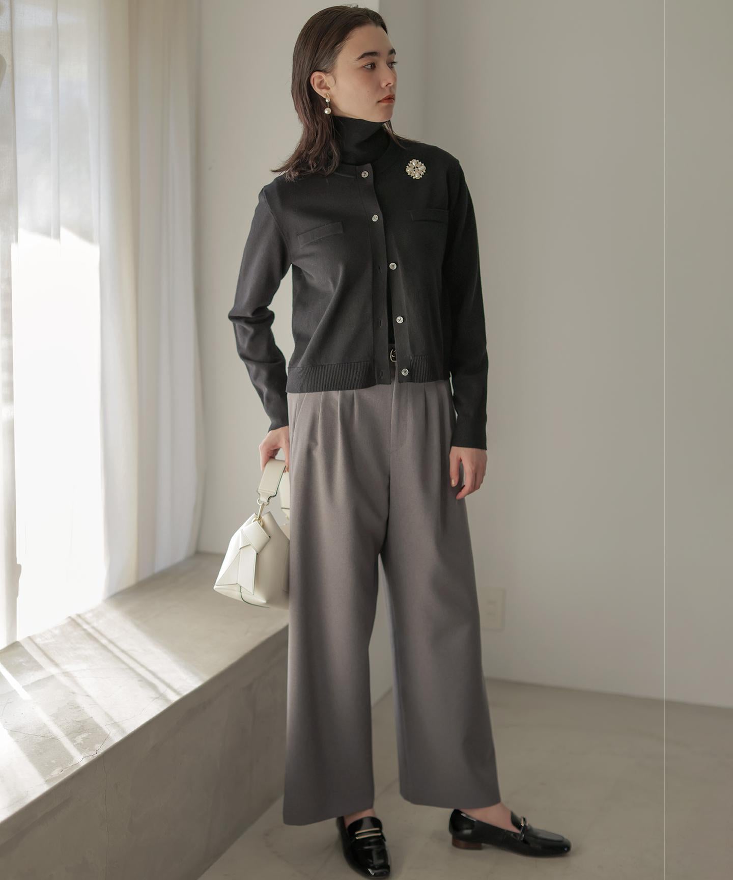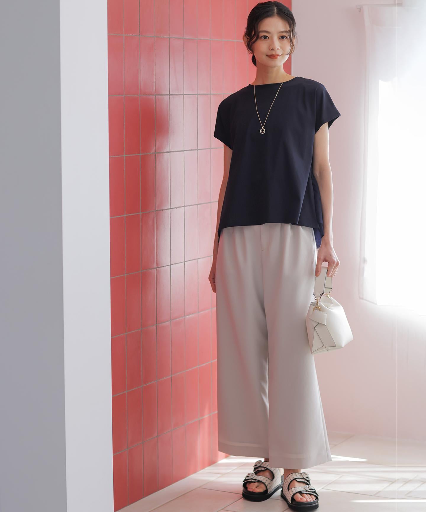 ■デザイン・フロントに入る3本のタックで、立体感のある自然なラインを演出。・後ろのゴムは特殊な刺繍ステッチでまるでリブの様な仕上がりでボトムスをインした時にもデザインポイントになります。・オフィスカジュアルにもデイリーにも活躍する万能アイテムです。・#002サンドベージュ系 総裏 #003グレー系・075ネイビー系 裏なし