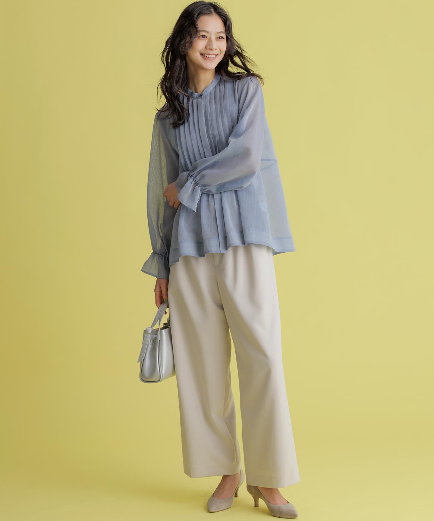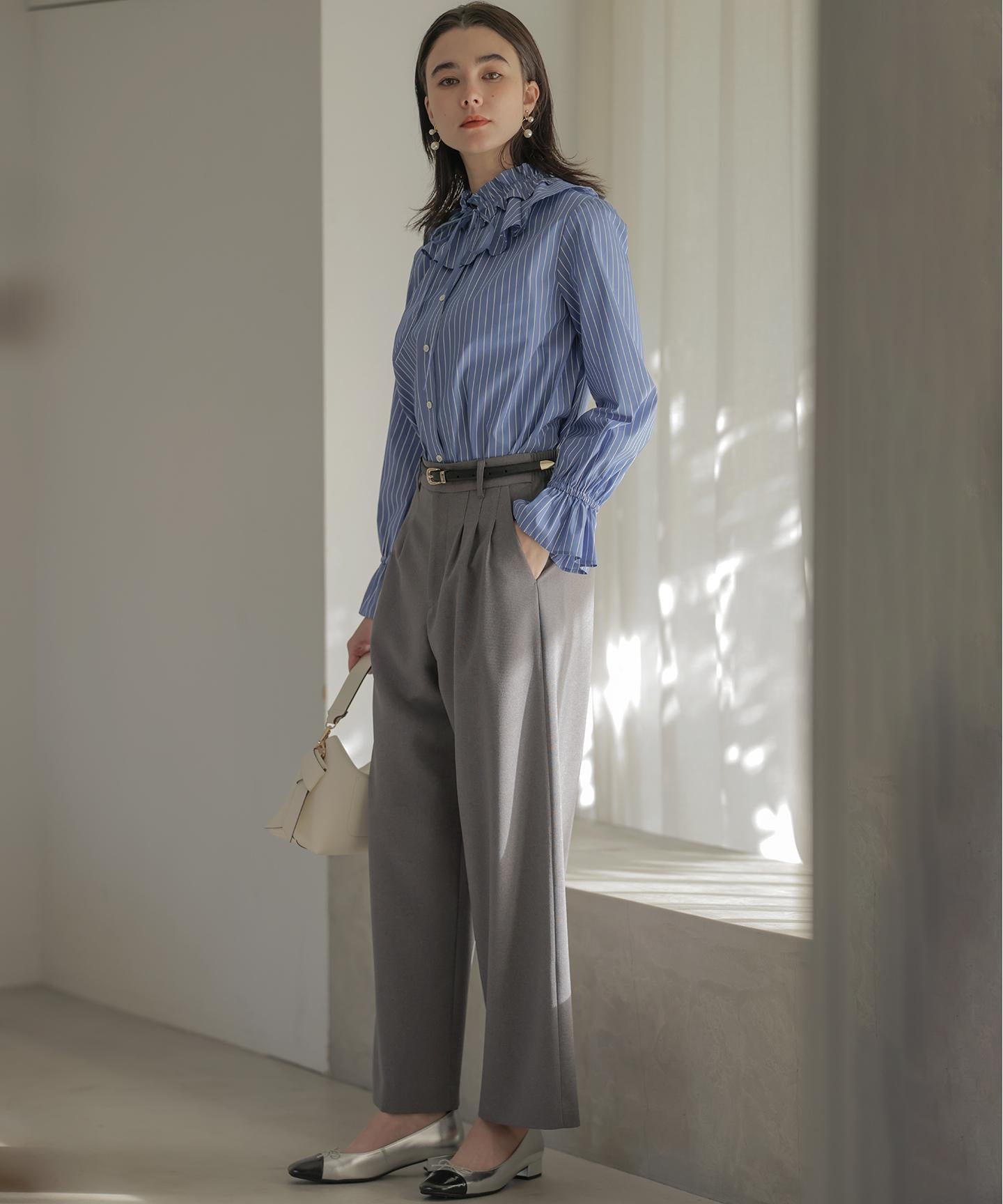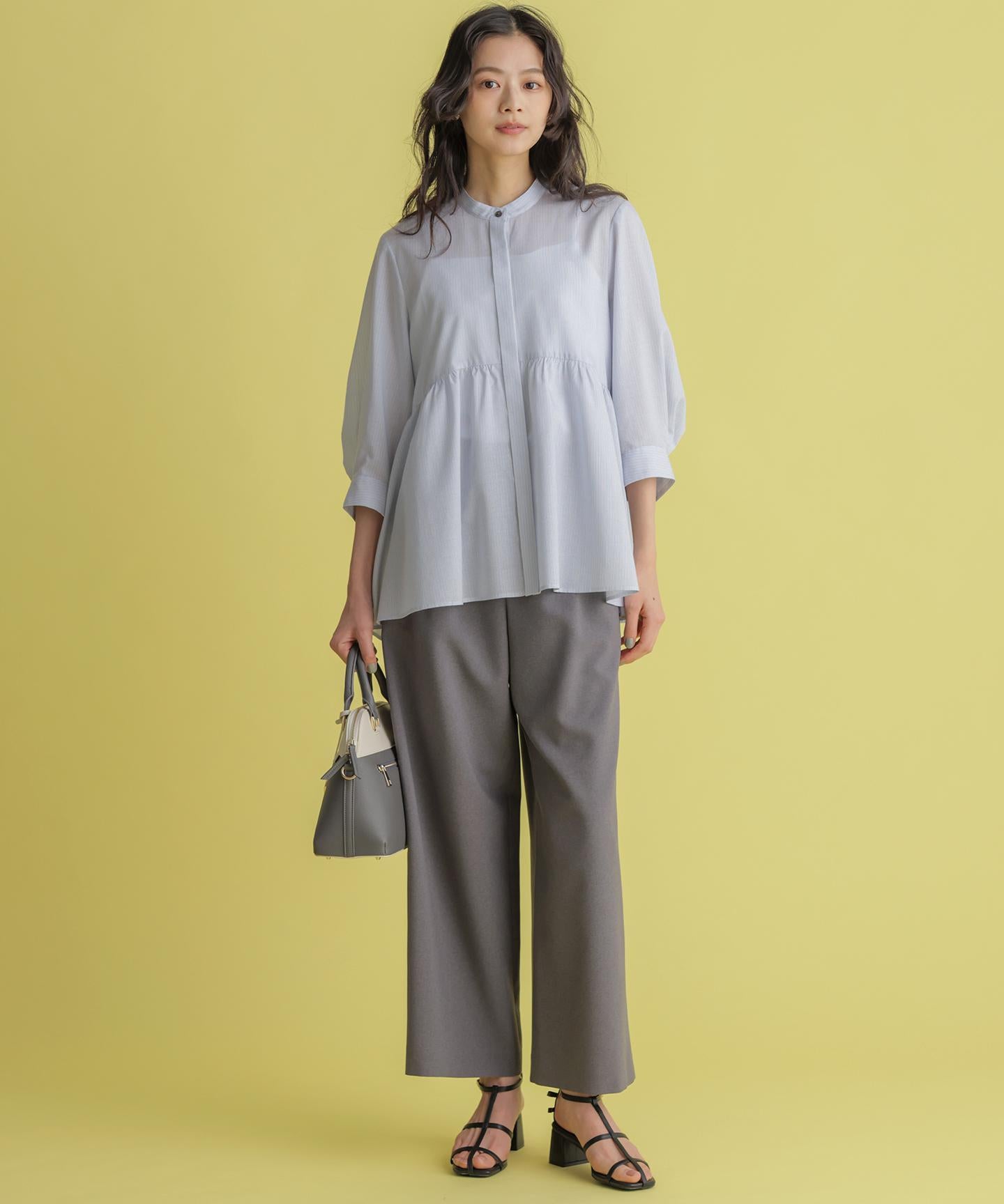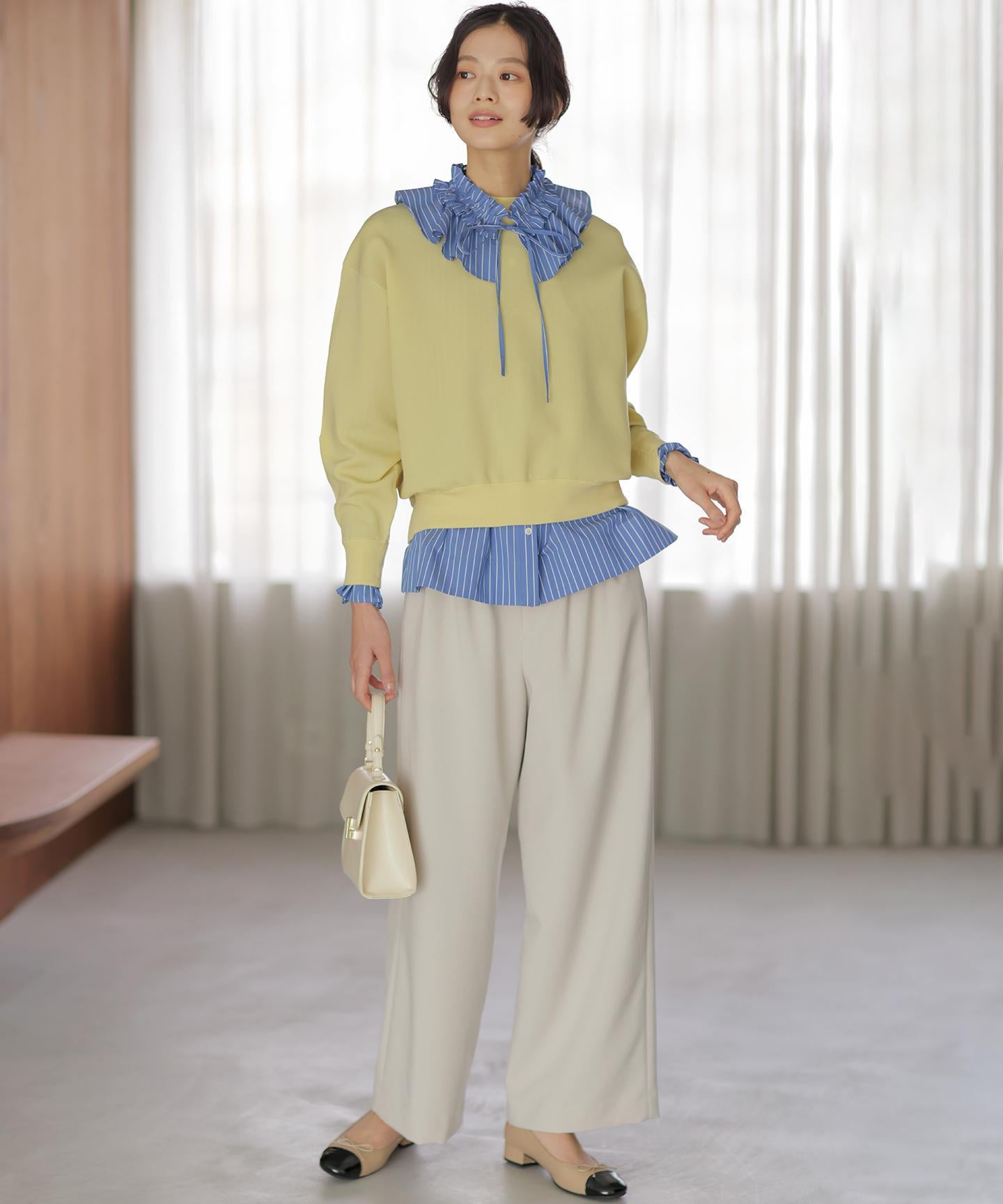 ■デザイン・フロントに入る3本のタックで、立体感のある自然なラインを演出。・後ろのゴムは特殊な刺繍ステッチでまるでリブの様な仕上がりでボトムスをインした時にもデザインポイントになります。・オフィスカジュアルにもデイリーにも活躍する万能アイテムです。・#002サンドベージュ系 総裏 #003グレー系・075ネイビー系 裏なし