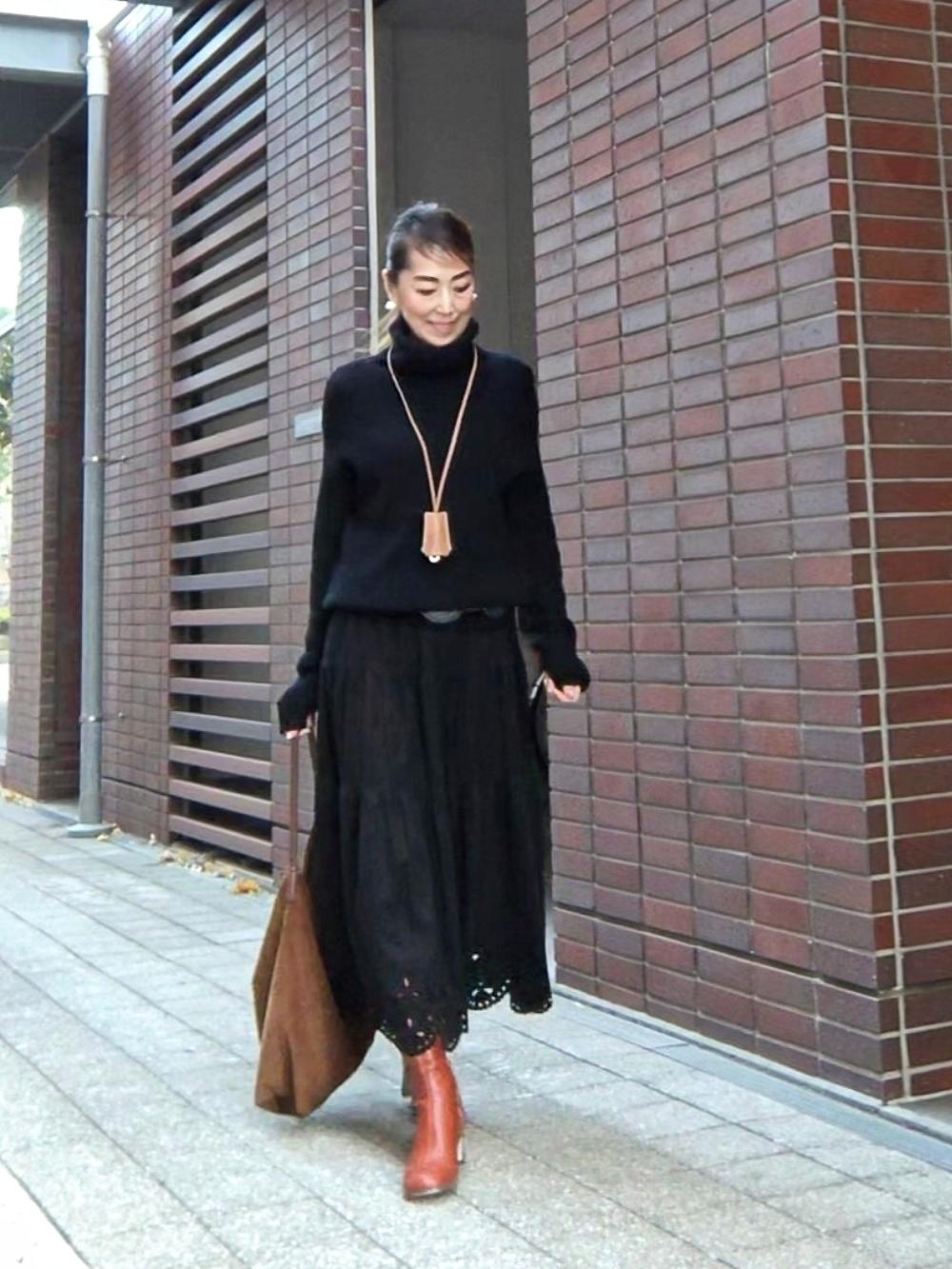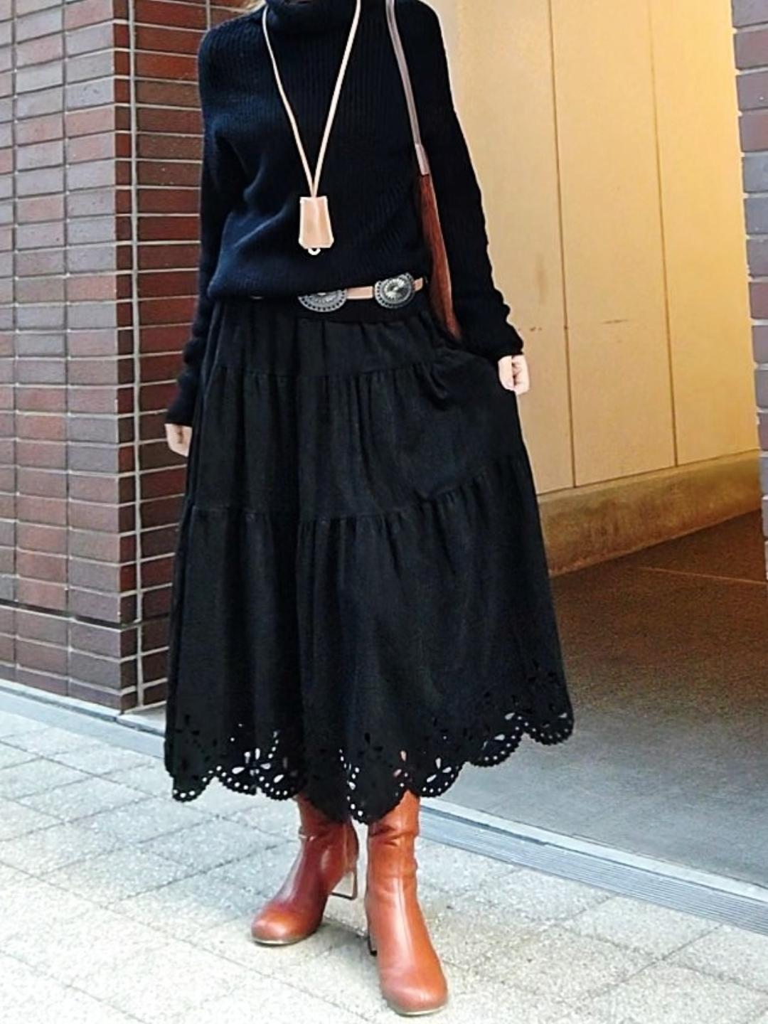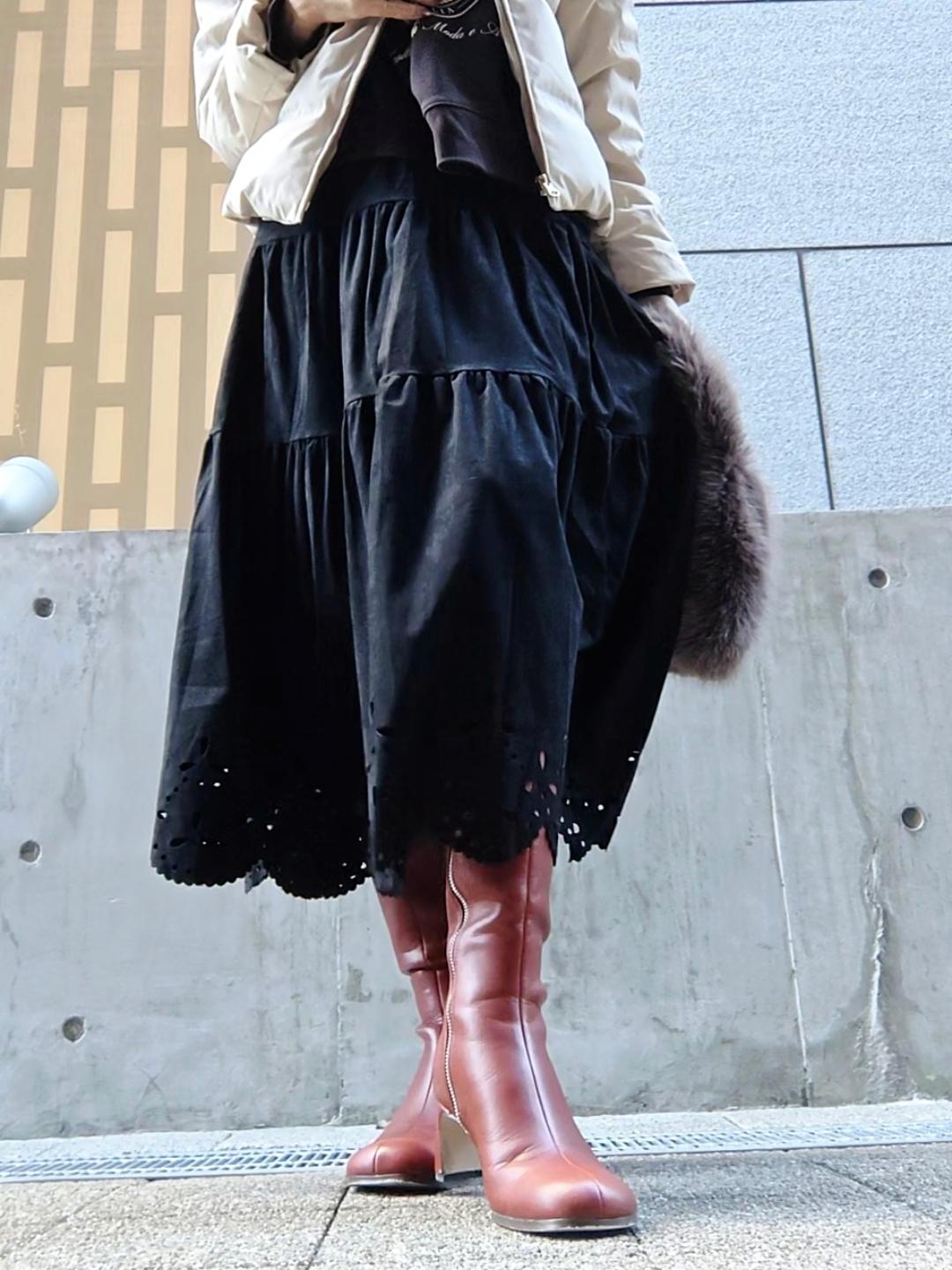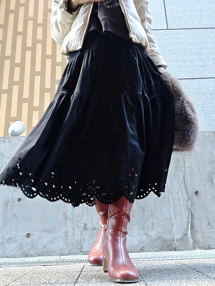 パンチングで裾も軽やか…ブラックで甘さを抑えたきれいめな大人のティアードスカート