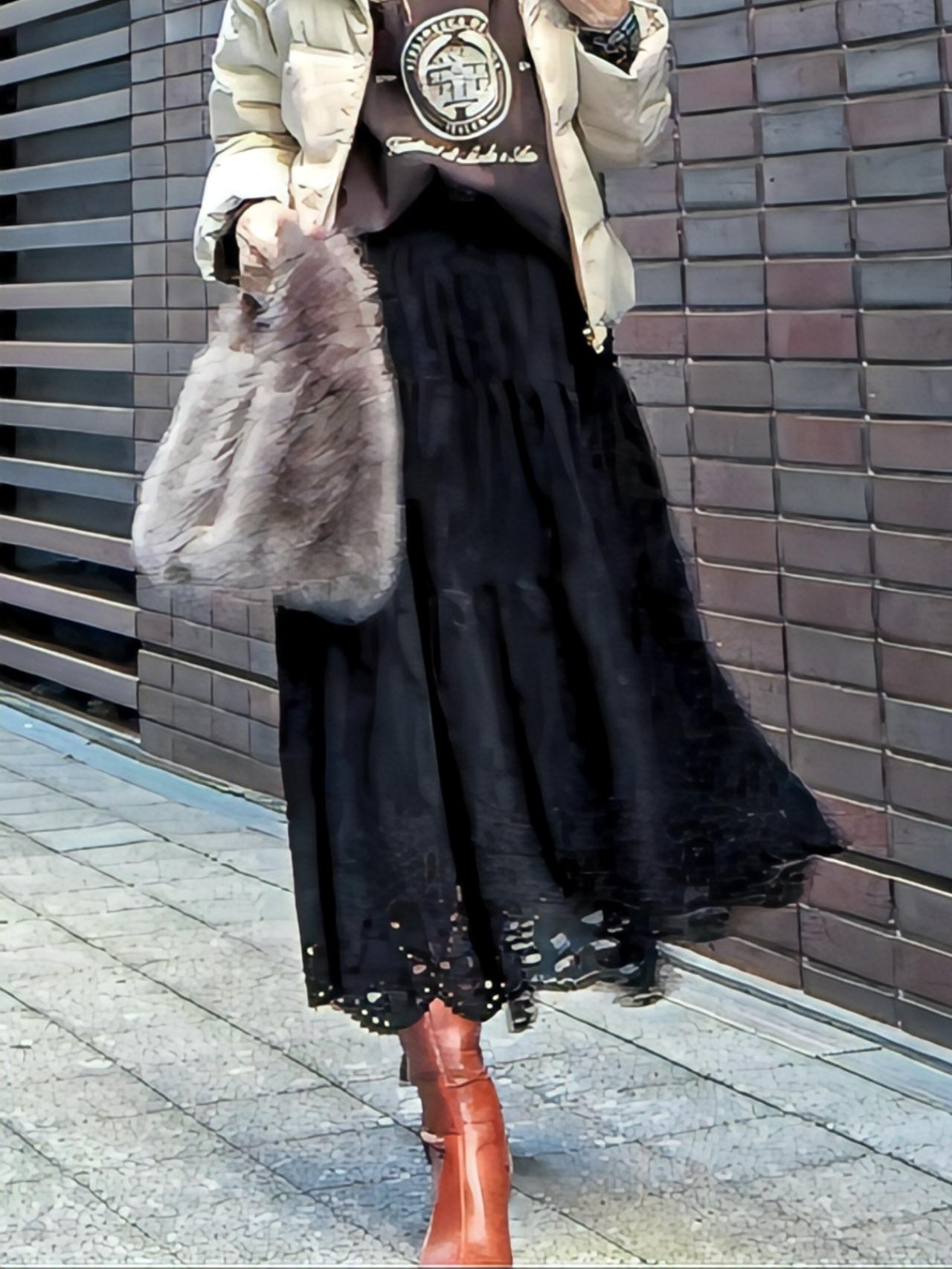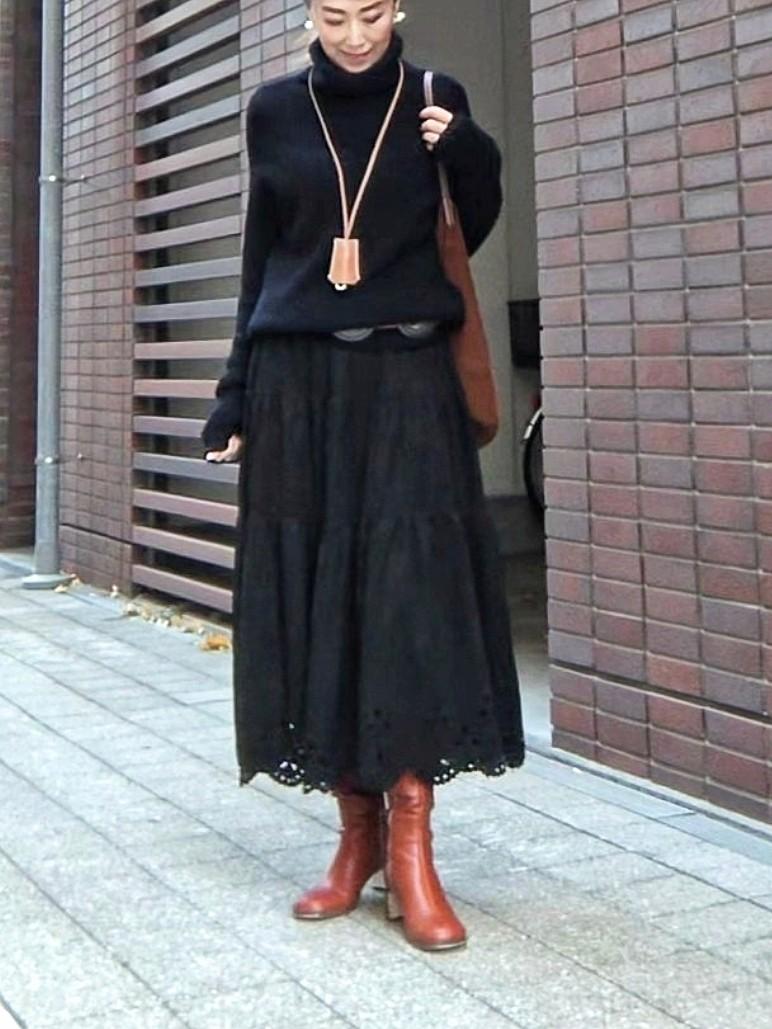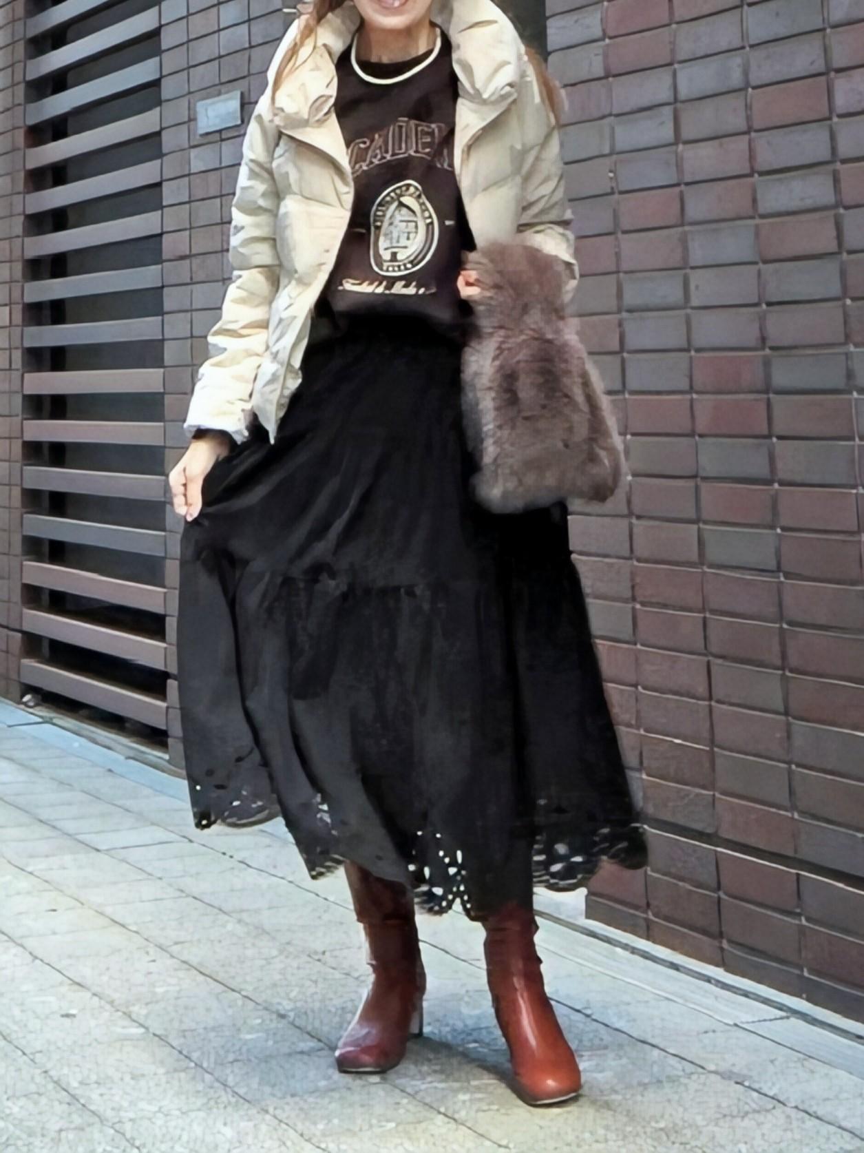 パンチングで裾も軽やか…ブラックで甘さを抑えたきれいめな大人のティアードスカート