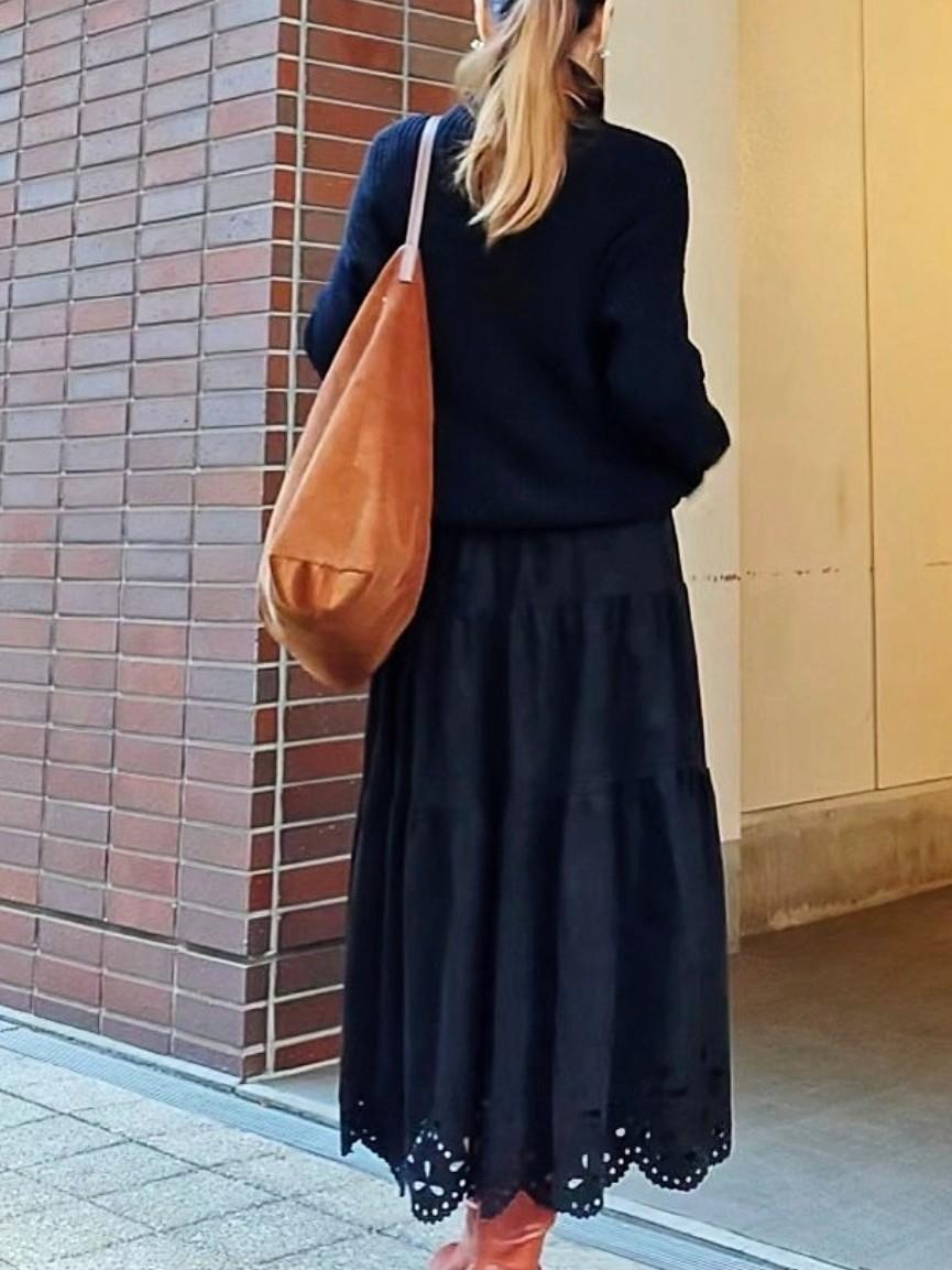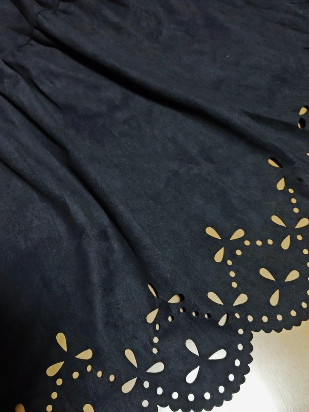 スエード調のパンチングスカート。ティアードのふんわりシルエットがとても上品で、可愛いらしさをブラックで締め大人きれいめコーデが叶います。裾のパンチングが軽やかな印象を与えてくれるオシャレなスカートです。