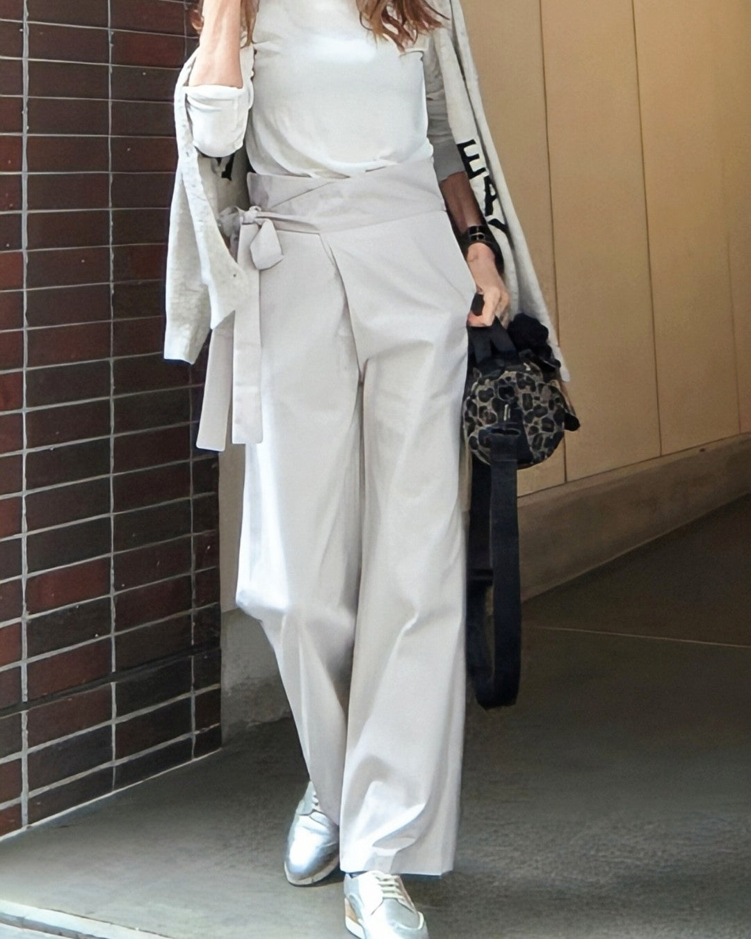 フロントで交差するラップ式のパンツは共布のリボンで調整、
