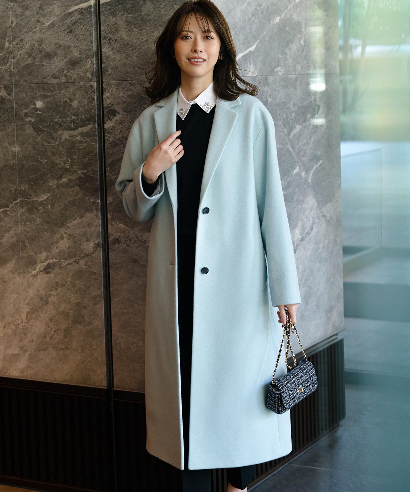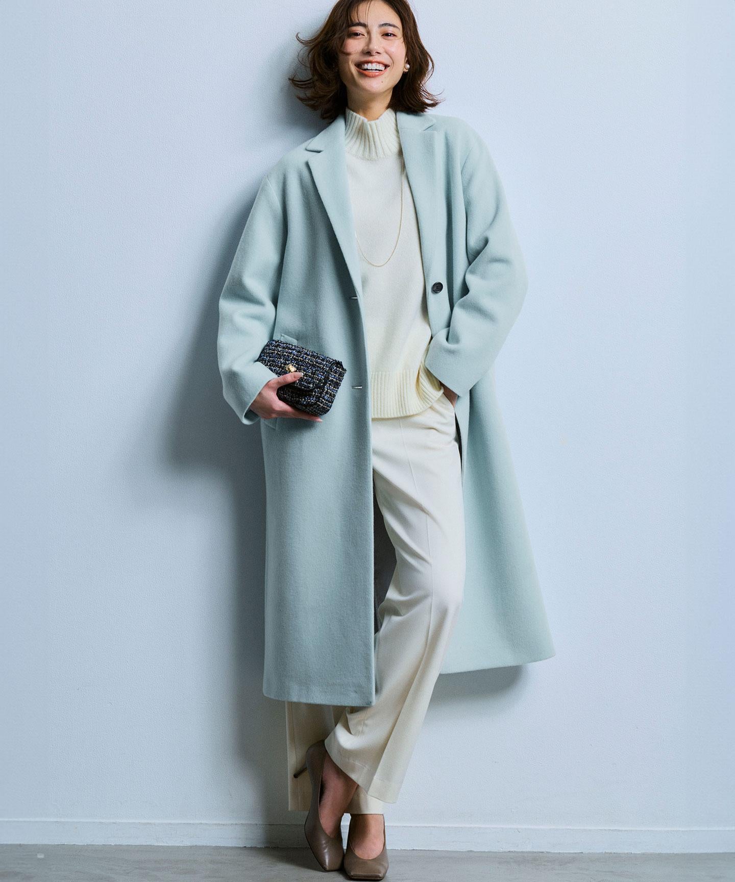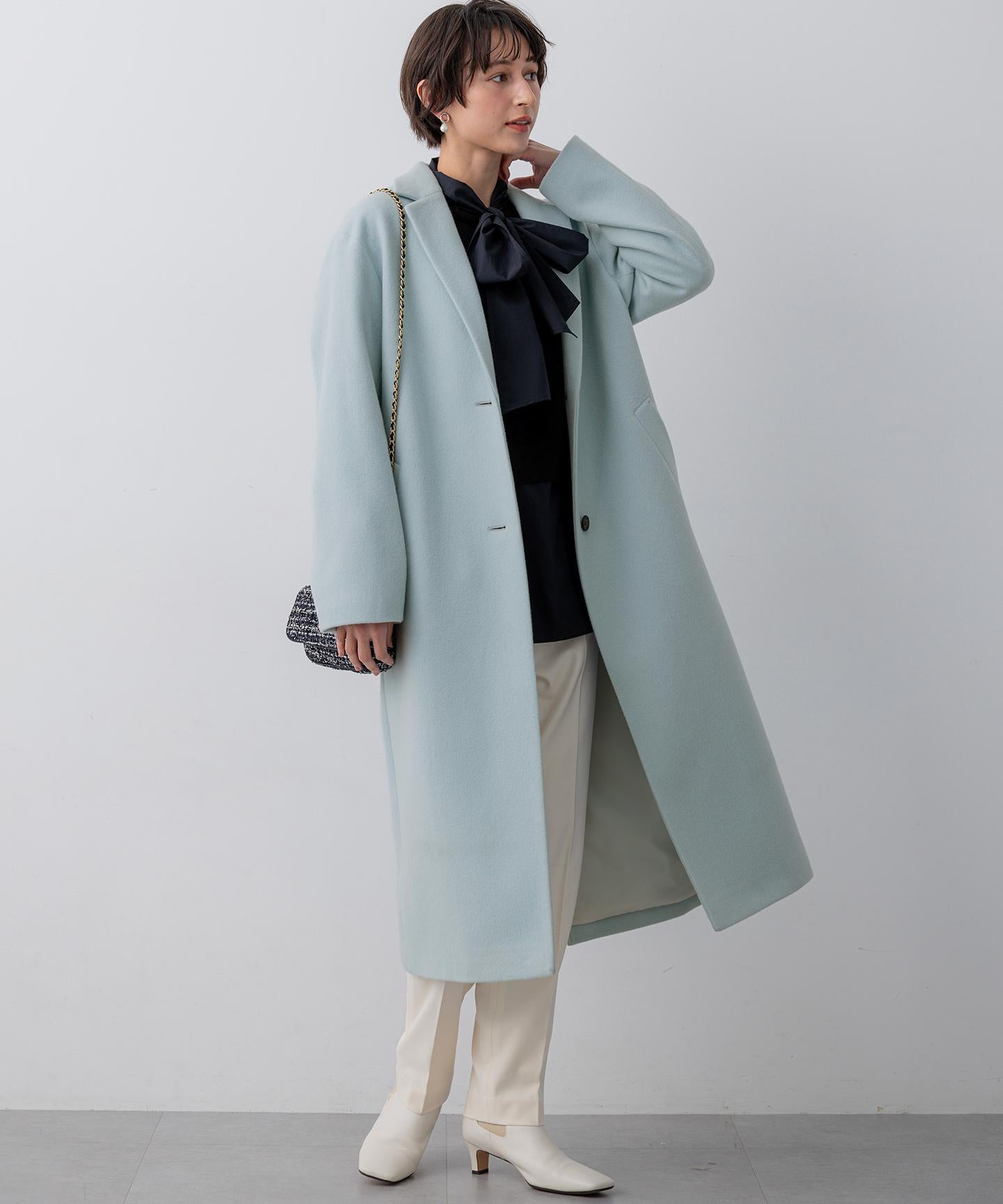 身頃の分量をしっかり取りながらも、着膨れ感のないすっきりおさまるフォルムが美しいチェスターコート。ドロップショルダーのゆったりとしたシルエットに、ラペルと袖をスッキリと細目にすることで、絶妙なフォルムバランスをつけています。重たくなりがちな冬のスタイリングに華やぎをもたらしてくれるパステルカラーとあいまって、大人らしい上品な仕上がりです。カラーは、柔らかく温かみのあるライトピンク(#012)、シャーベットカラーのスカイブルー(#072)、馴染みが良くスタイリングにまとまりを与えるライトグレー(#003)の3色展開です。