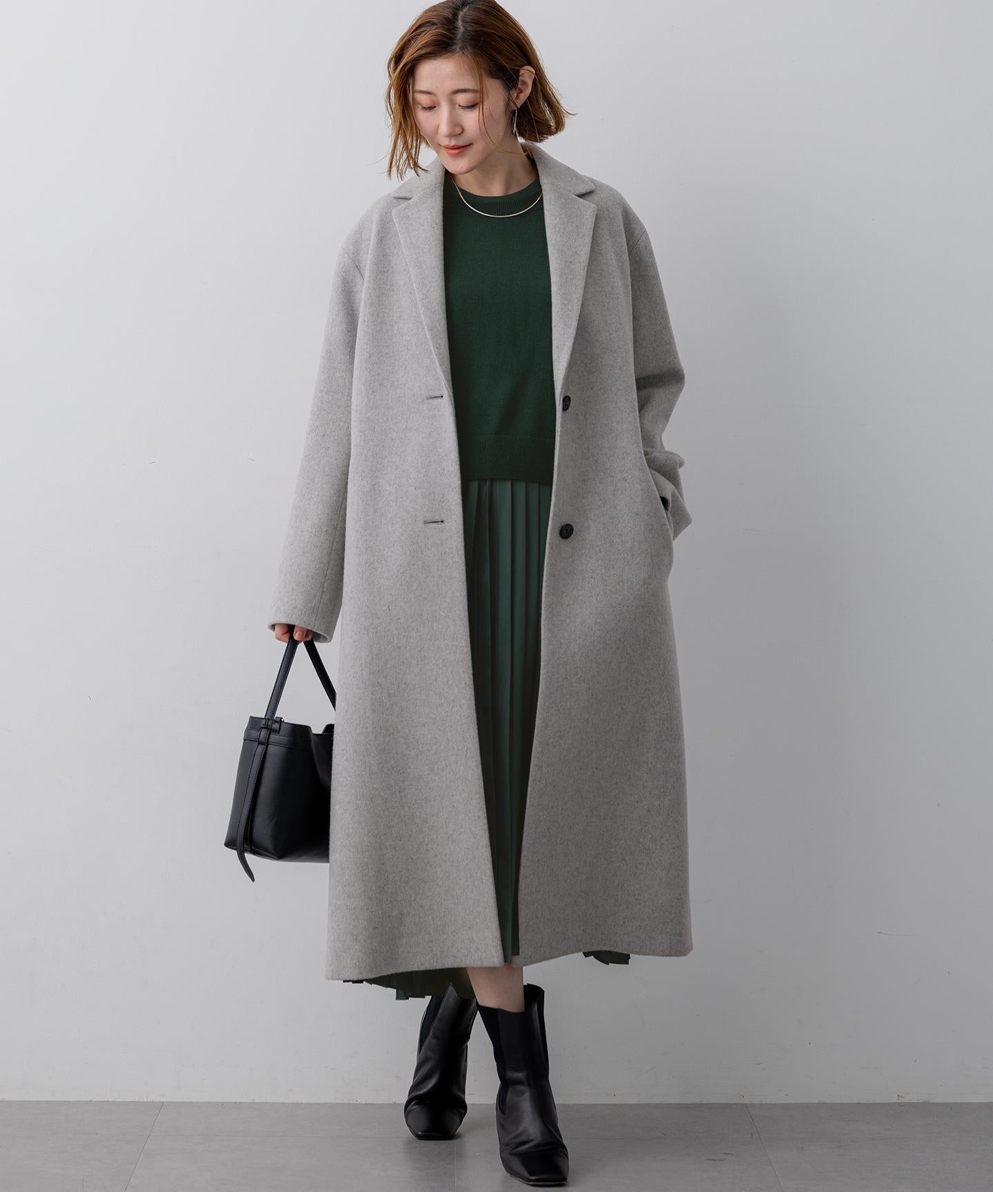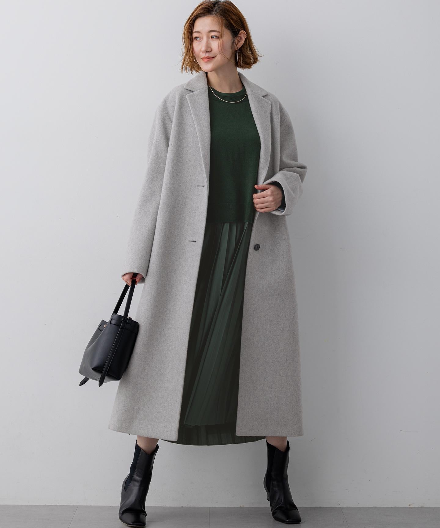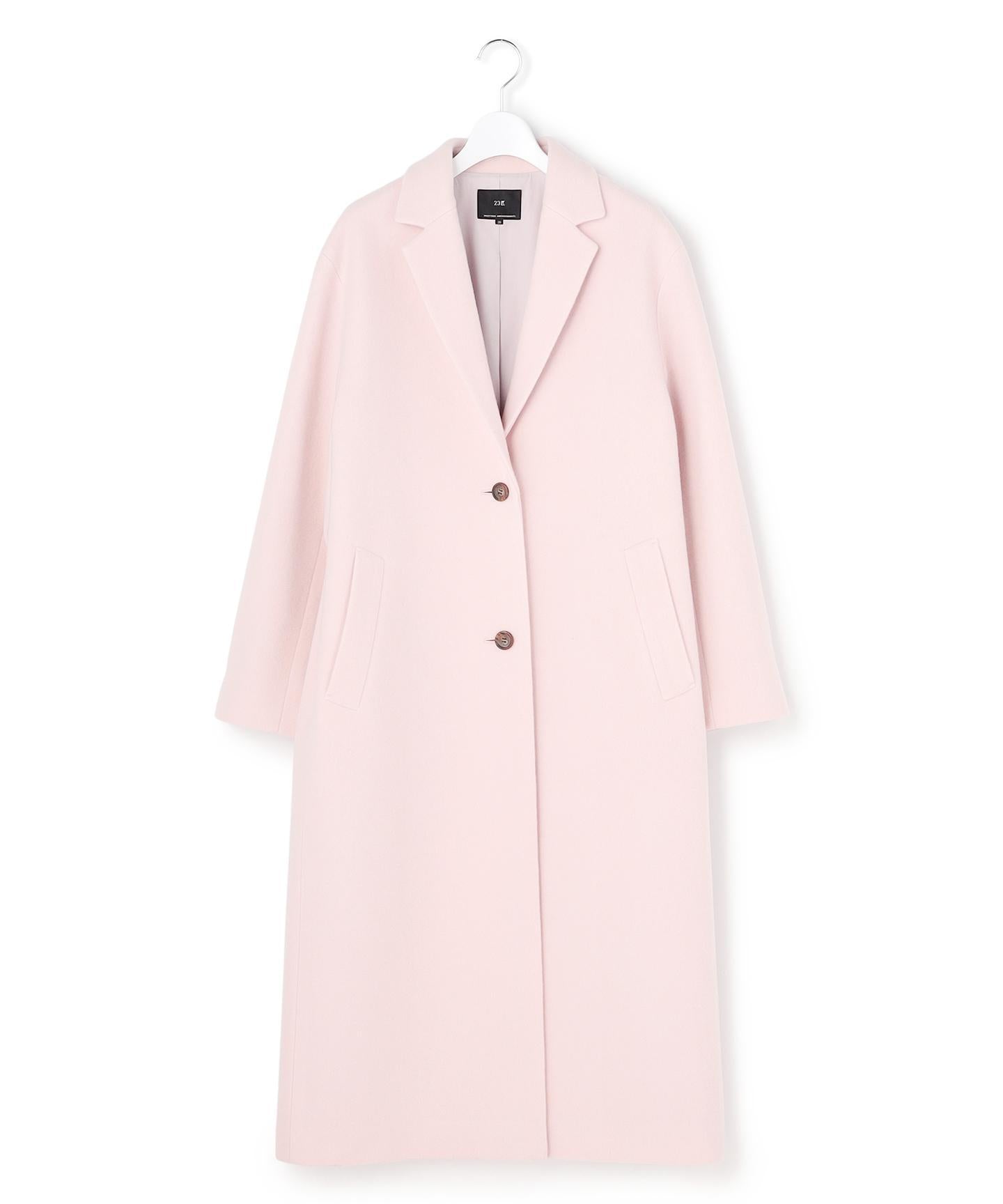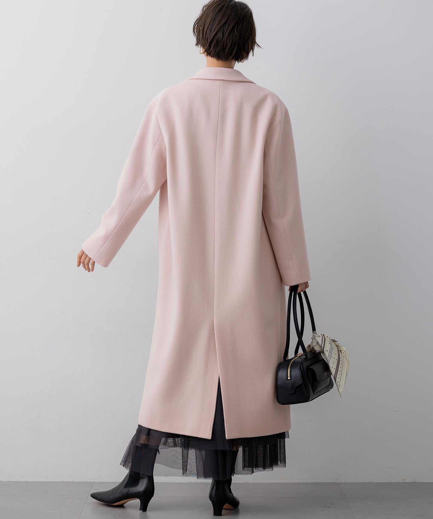 身頃の分量をしっかり取りながらも、着膨れ感のないすっきりおさまるフォルムが美しいチェスターコート。ドロップショルダーのゆったりとしたシルエットに、ラペルと袖をスッキリと細目にすることで、絶妙なフォルムバランスをつけています。重たくなりがちな冬のスタイリングに華やぎをもたらしてくれるパステルカラーとあいまって、大人らしい上品な仕上がりです。カラーは、柔らかく温かみのあるライトピンク(#012)、シャーベットカラーのスカイブルー(#072)、馴染みが良くスタイリングにまとまりを与えるライトグレー(#003)の3色展開です。