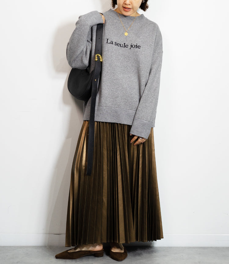 細かすぎないプリーツのひだが動きに合わせて贅沢に揺れるサマは圧巻。ブーツ、パンプス、スニーカーなんでもマッチする万能スカートです。