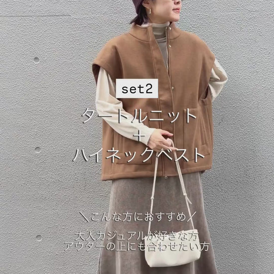 ベーシックなハイネックニットと、トレンド感のあるハイネックベストのセット。