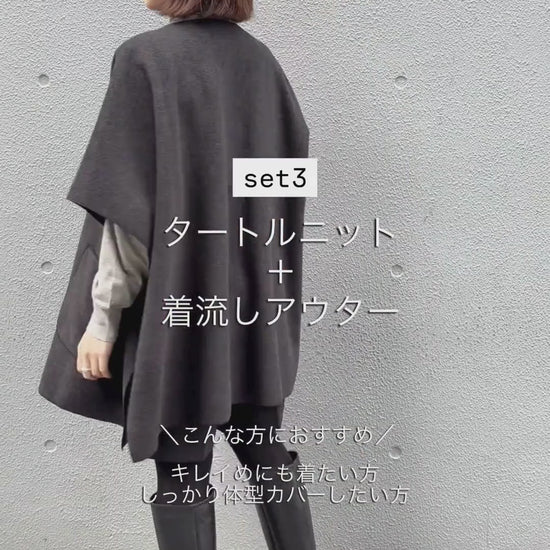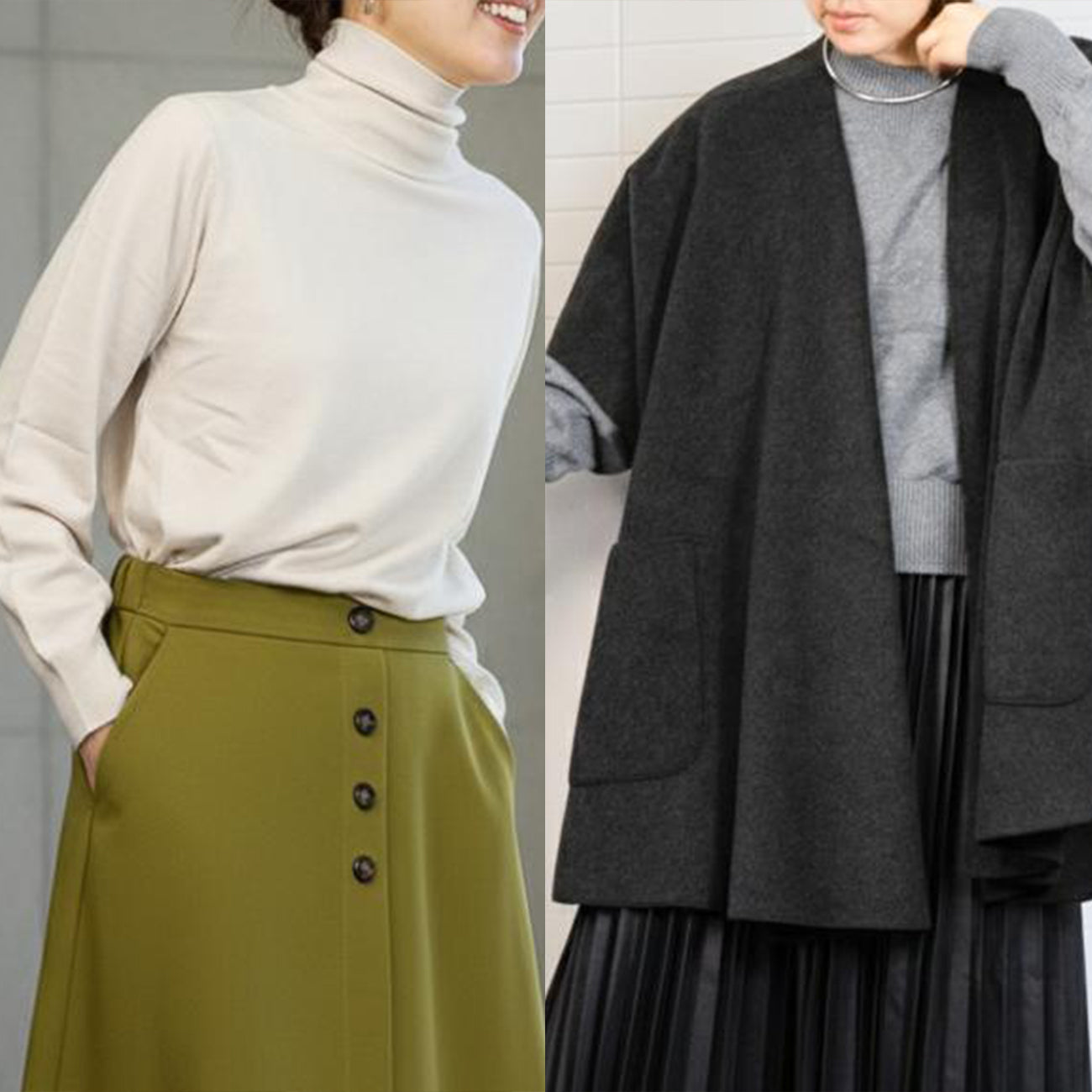 ベーシックなハイネックニットと、上質な手触りが魅力の着流しアウターのセット。