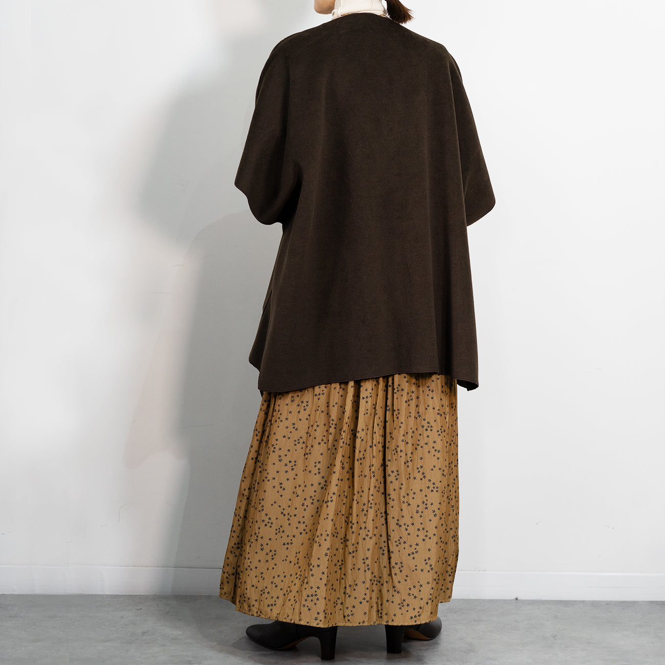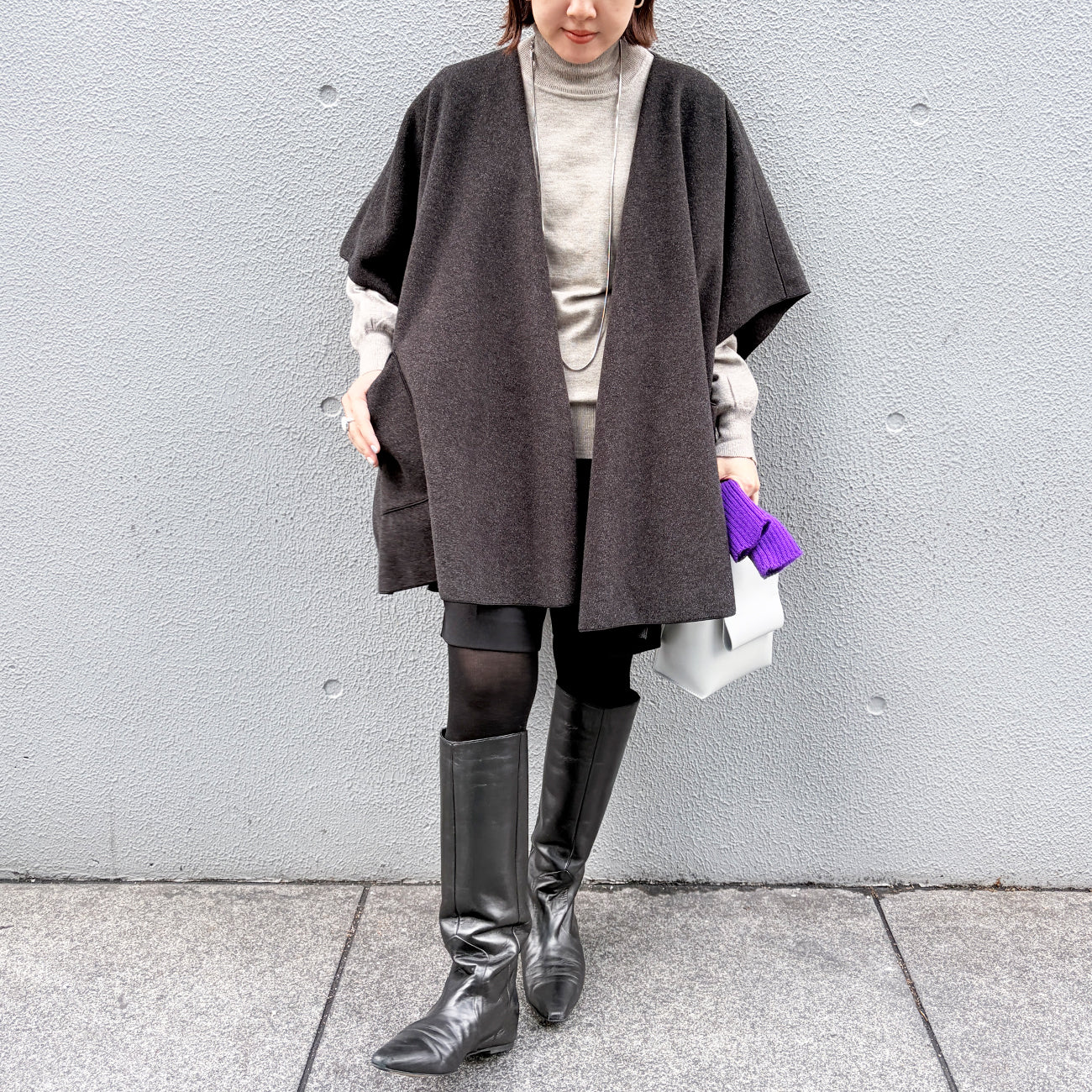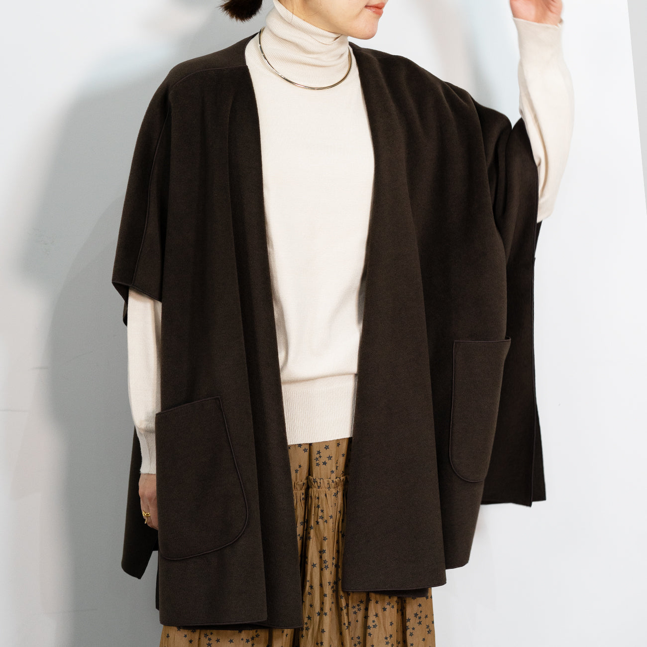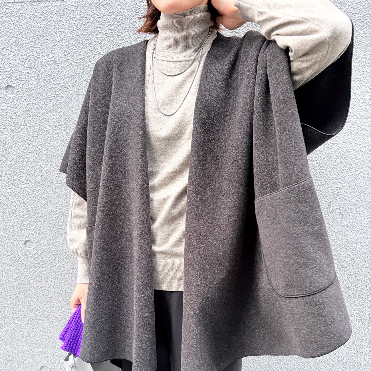 贅沢なドレープシルエットが魅力の着流しケープ。