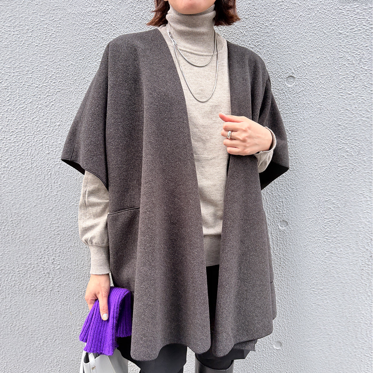 贅沢なドレープシルエットが魅力の着流しケープ。