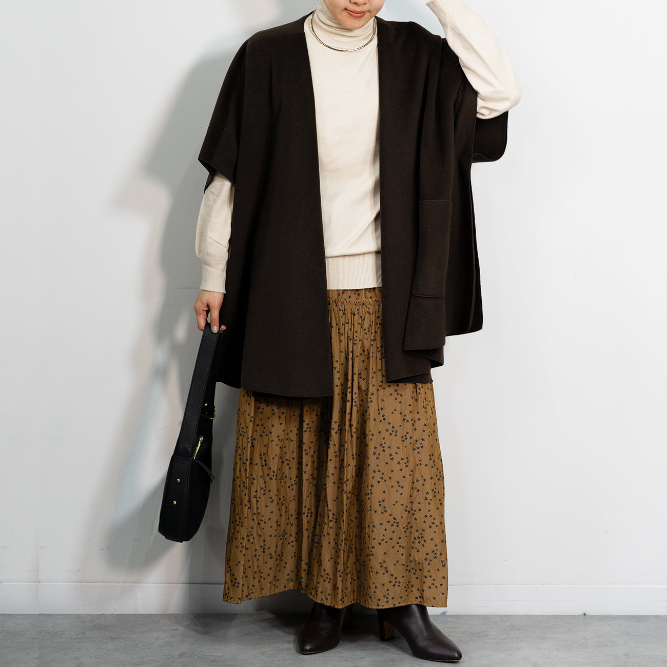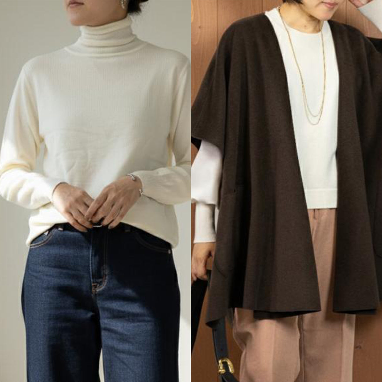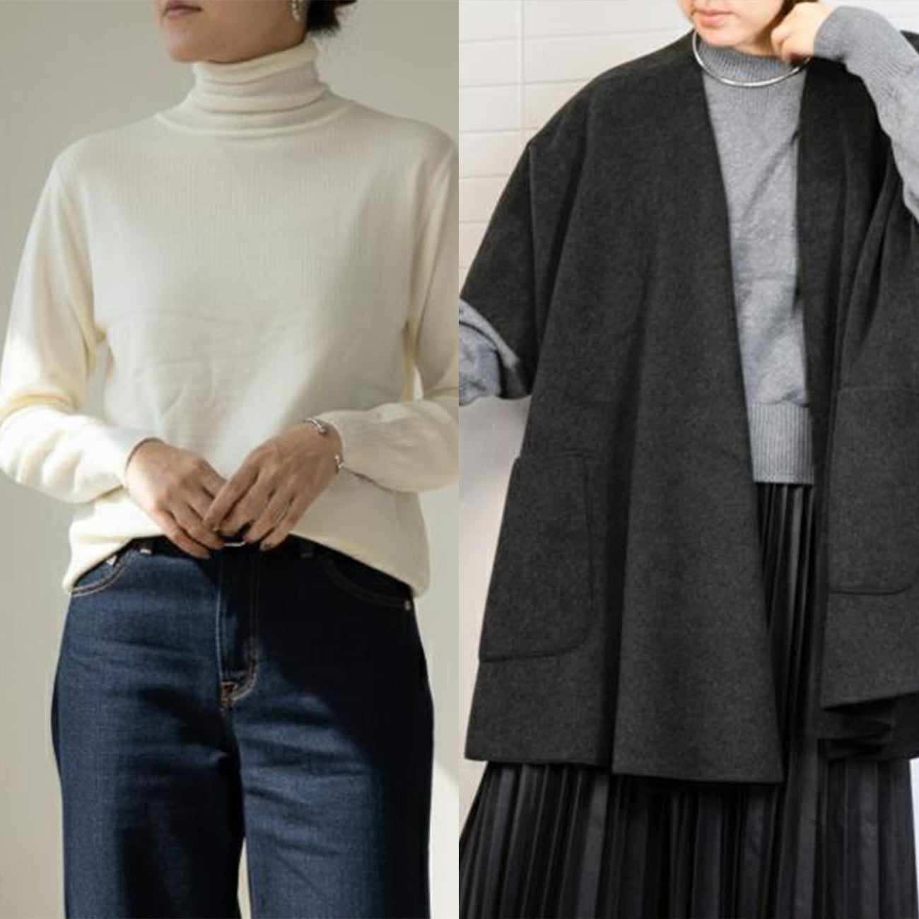 ベーシックなハイネックニットと、上質な手触りが魅力の着流しアウターのセット。