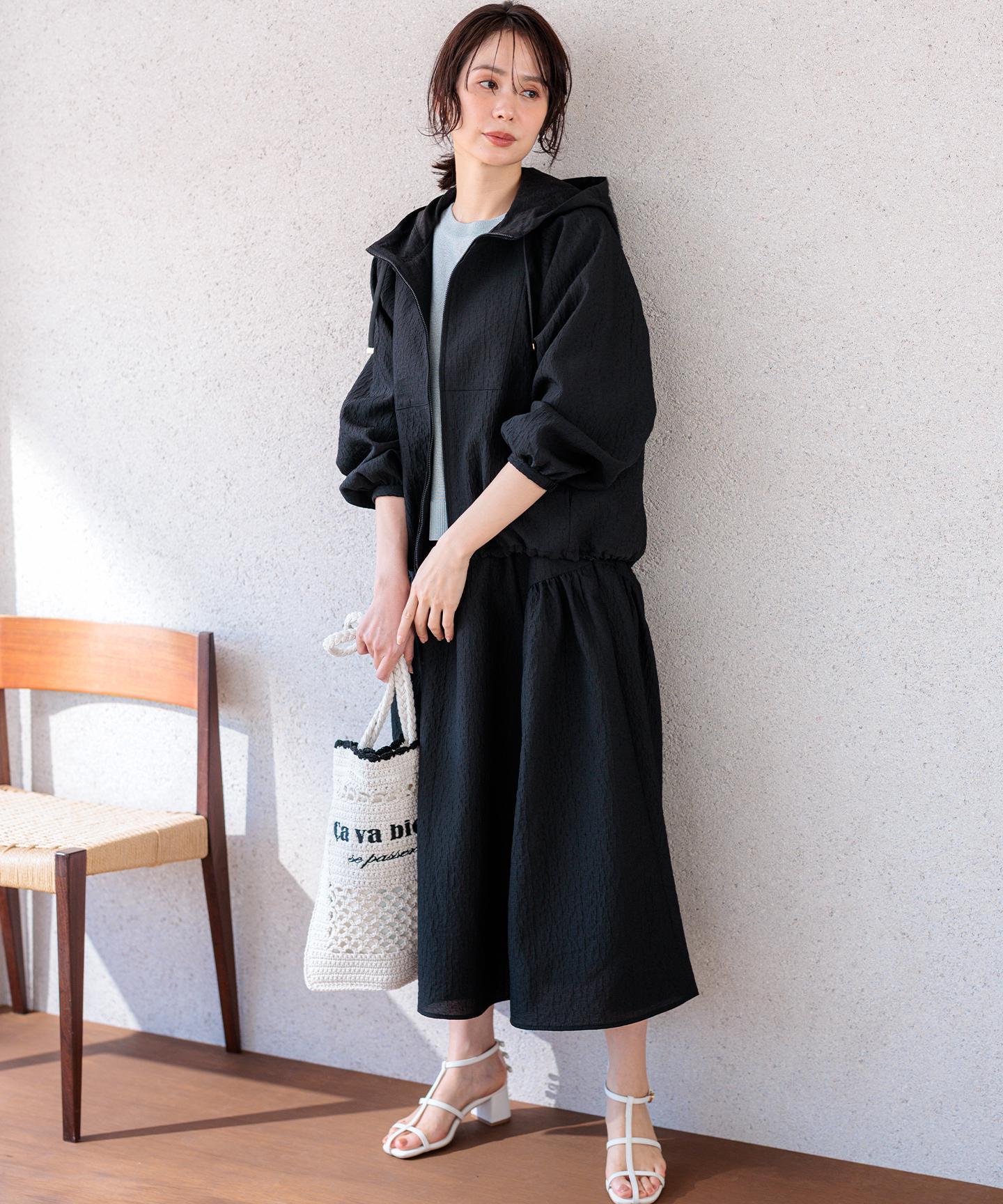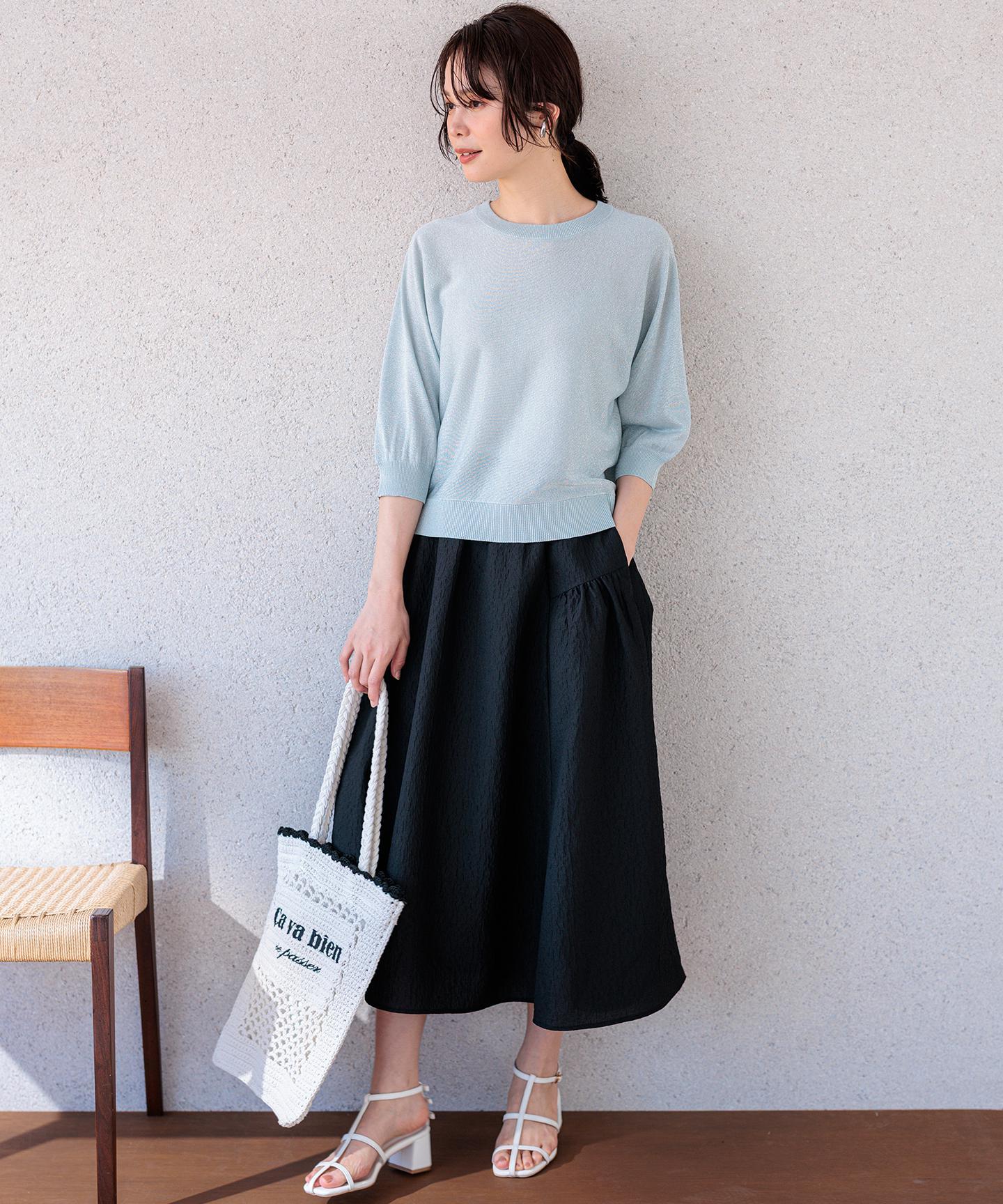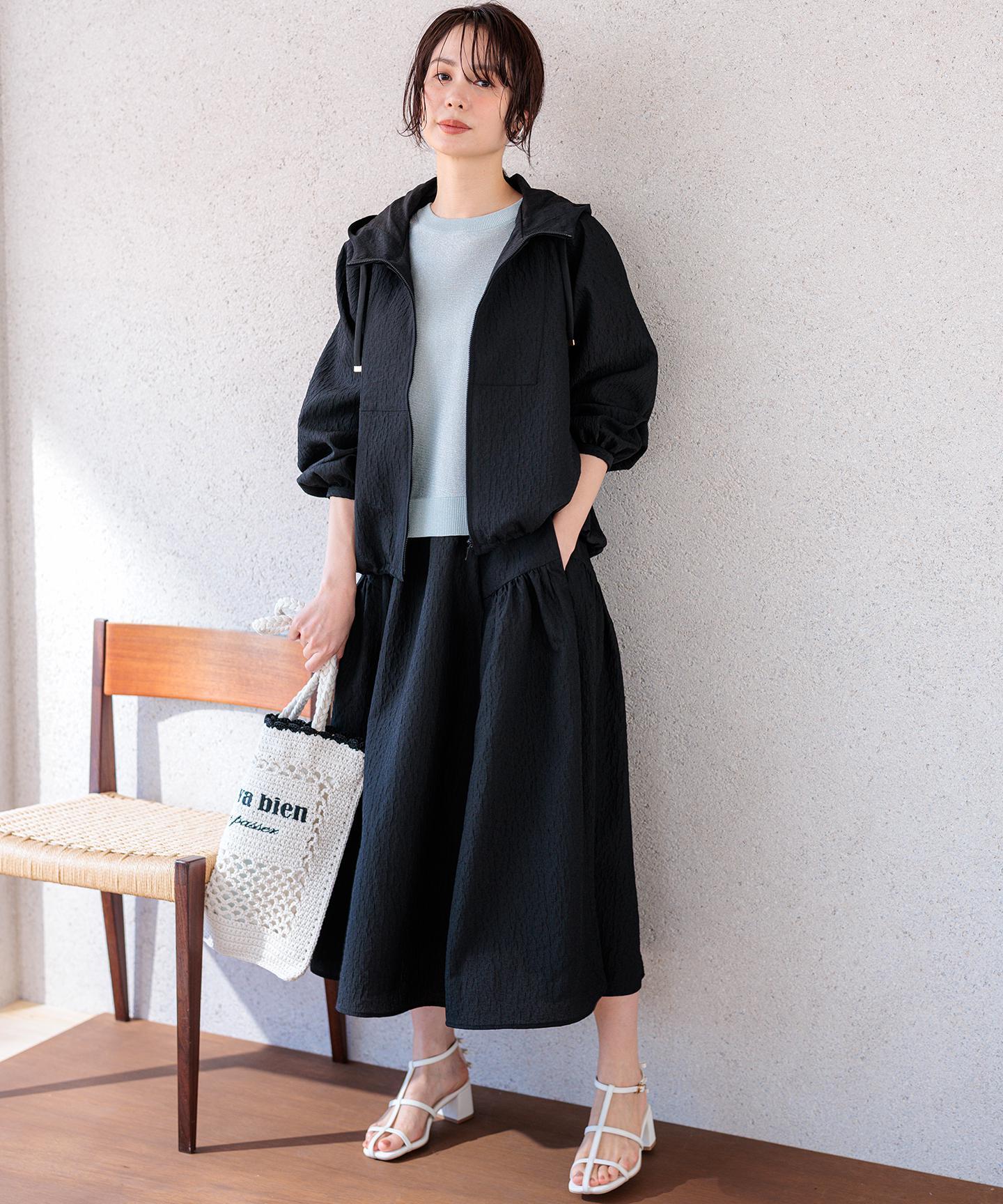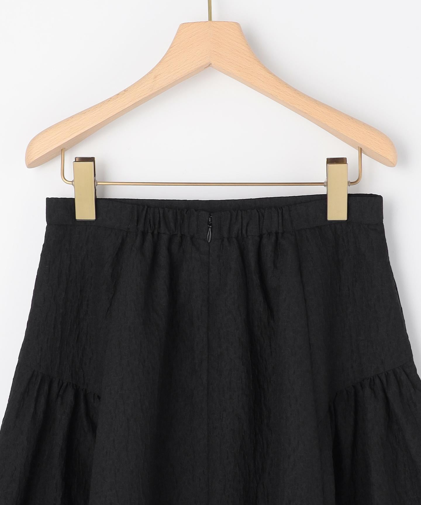 ■デザイン・切り替えギャザーデザインがアクセントになったふんわりとしたボリュームあるスカートです。・凹凸感あるジャカードの表情がトレンド感を増し、甘くなりすぎない大人な印象です。・後ウエストゴム使用でお腹回りも楽に着こなせます。・上品にもカジュアルにも着まわせるトレンドライクなスカートです。
