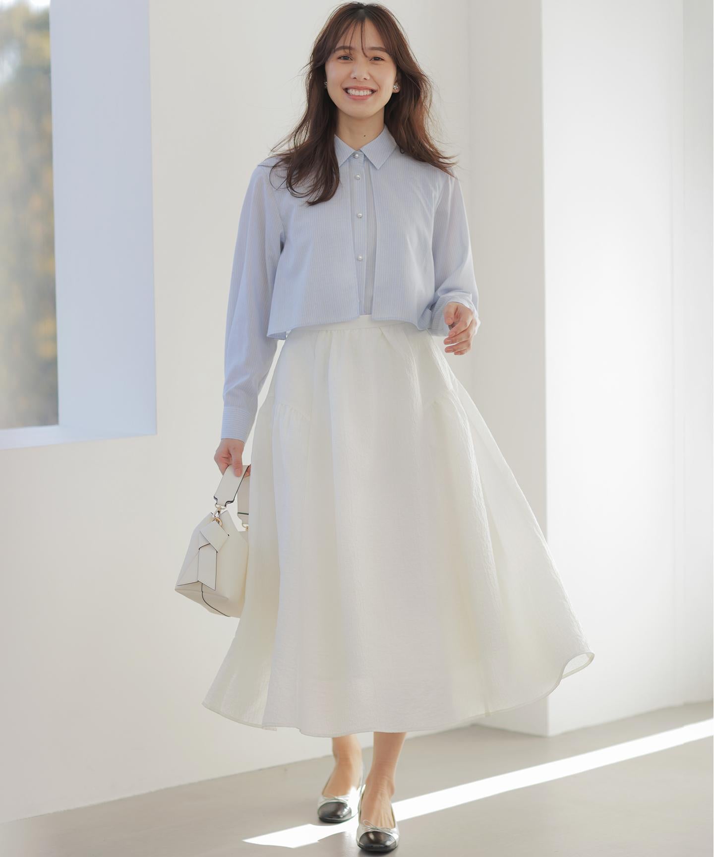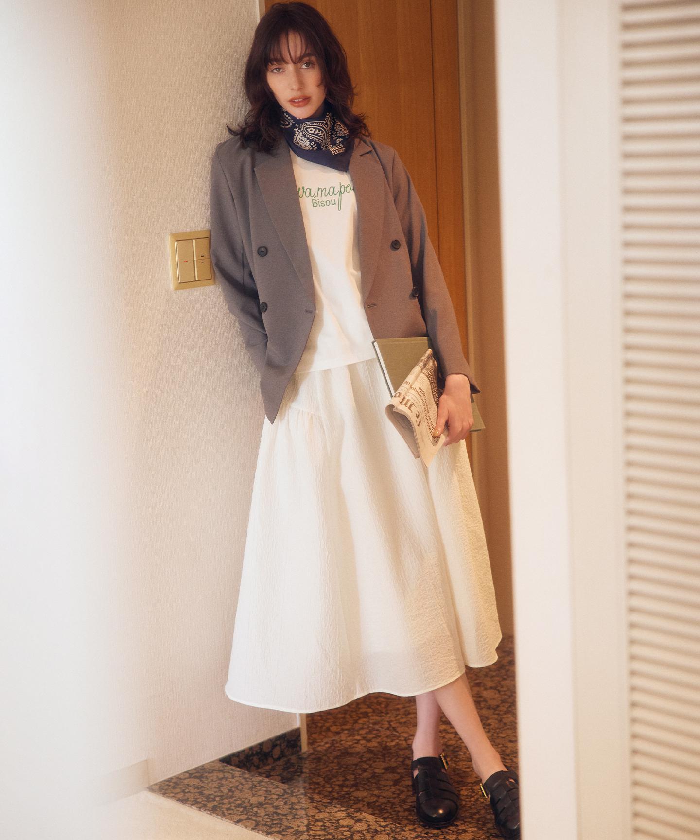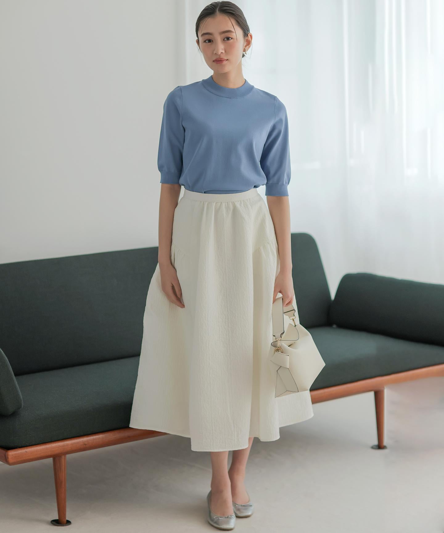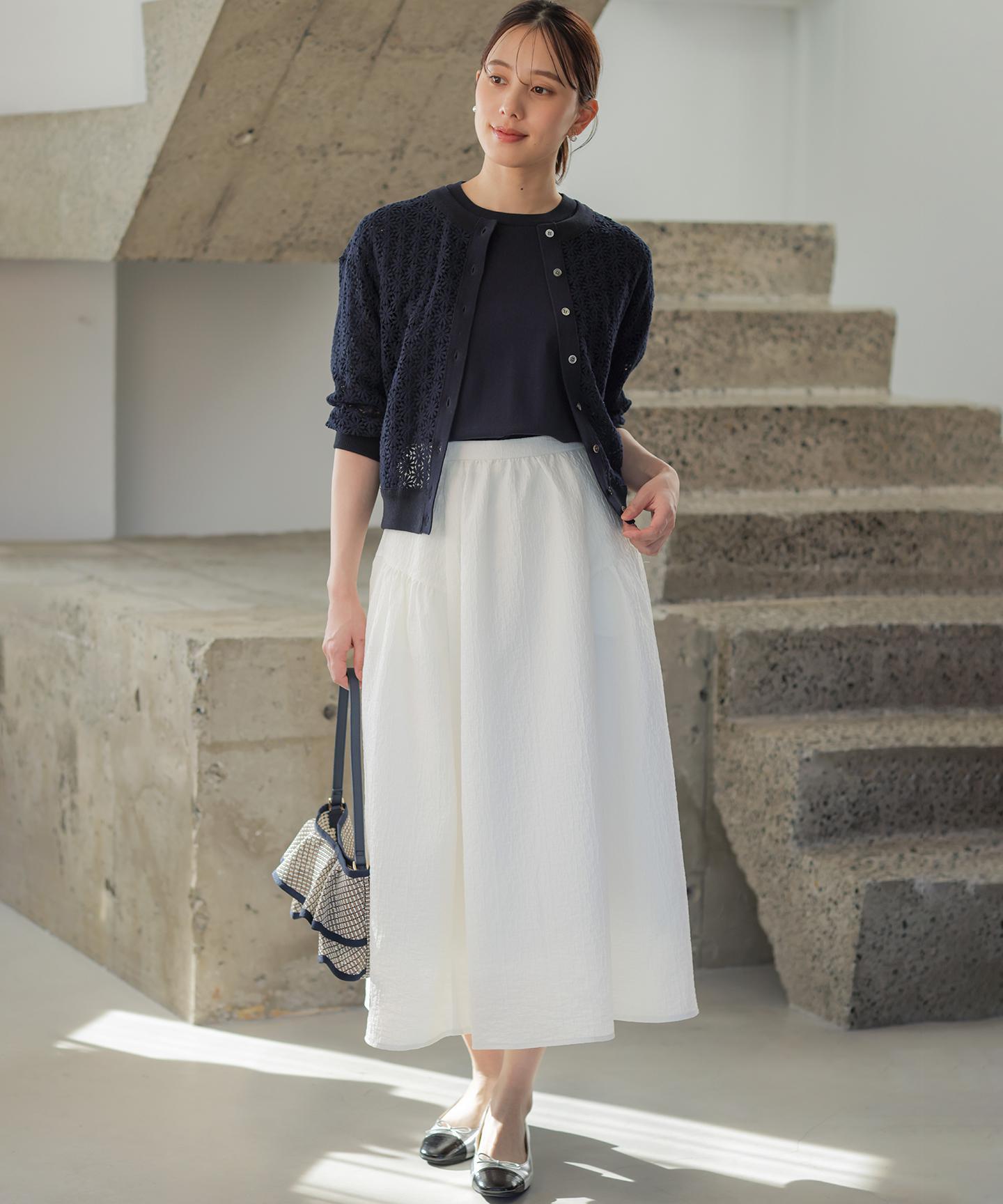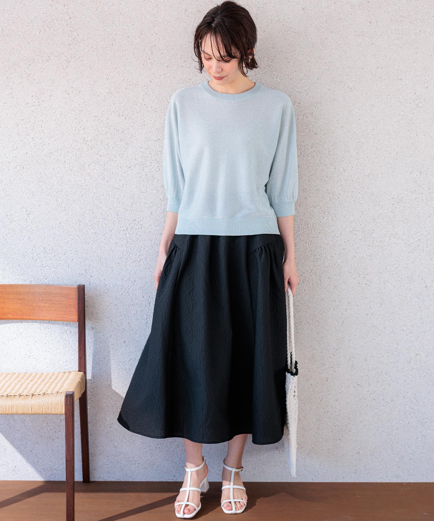 ■デザイン・切り替えギャザーデザインがアクセントになったふんわりとしたボリュームあるスカートです。・凹凸感あるジャカードの表情がトレンド感を増し、甘くなりすぎない大人な印象です。・後ウエストゴム使用でお腹回りも楽に着こなせます。・上品にもカジュアルにも着まわせるトレンドライクなスカートです。