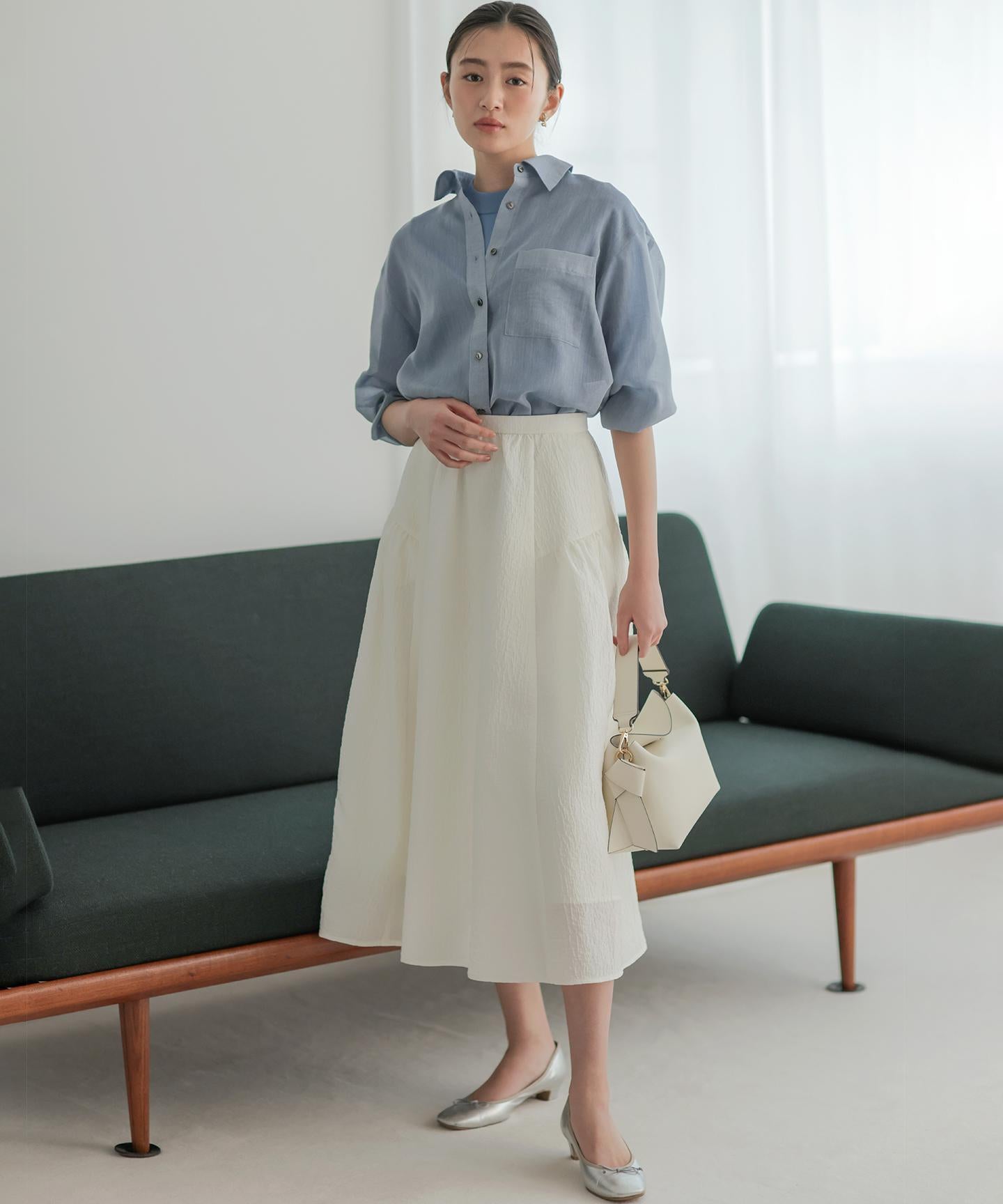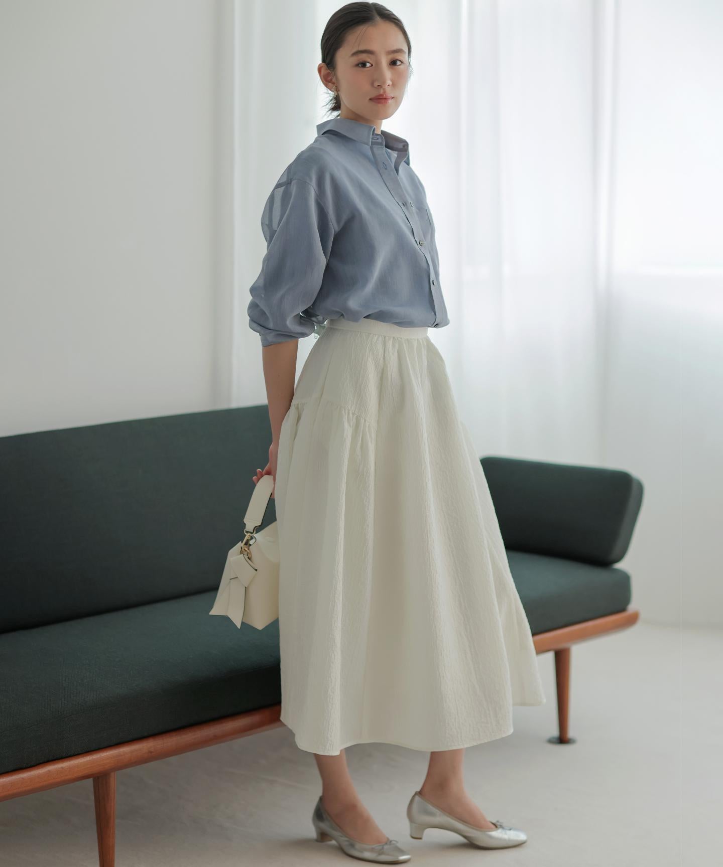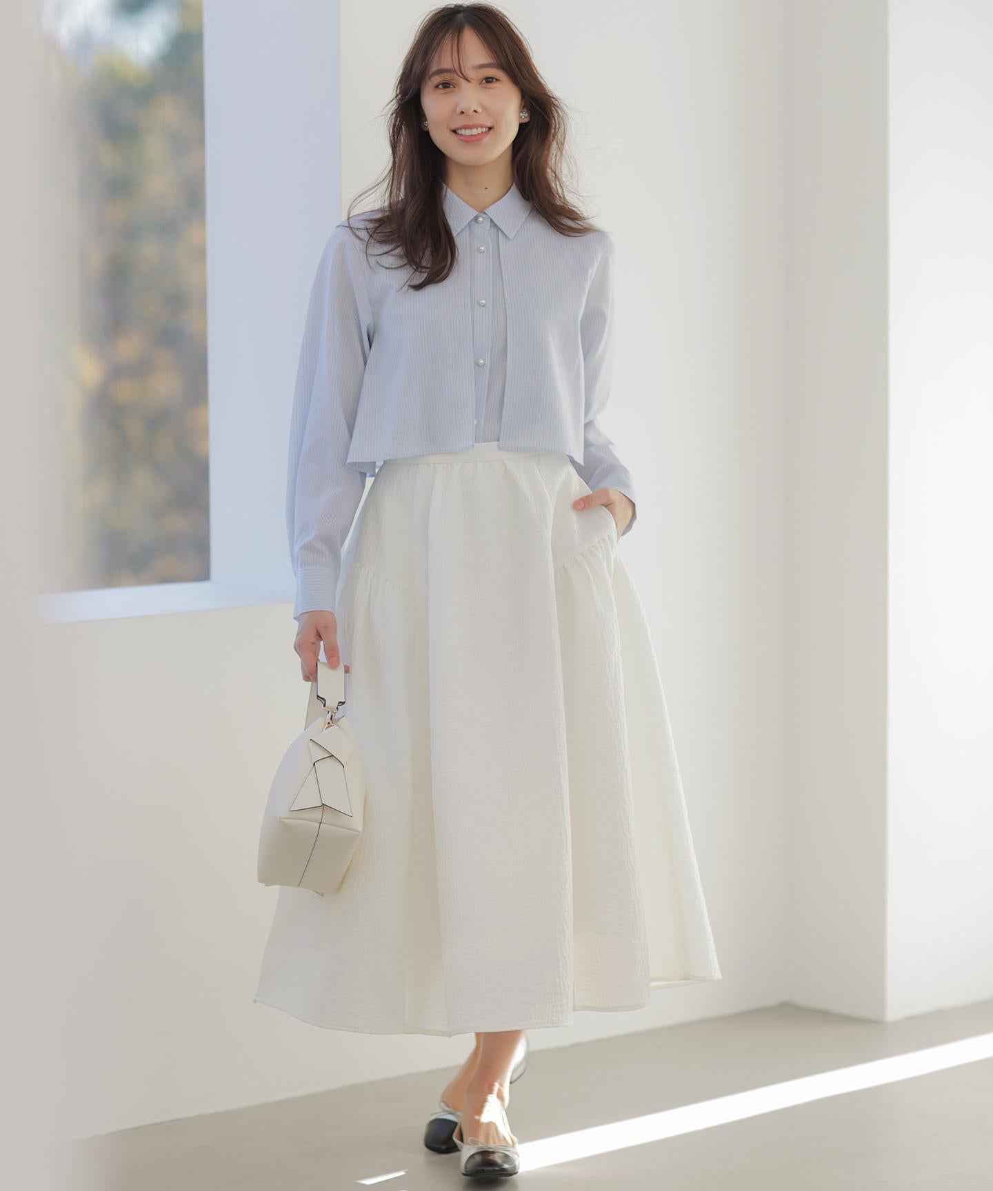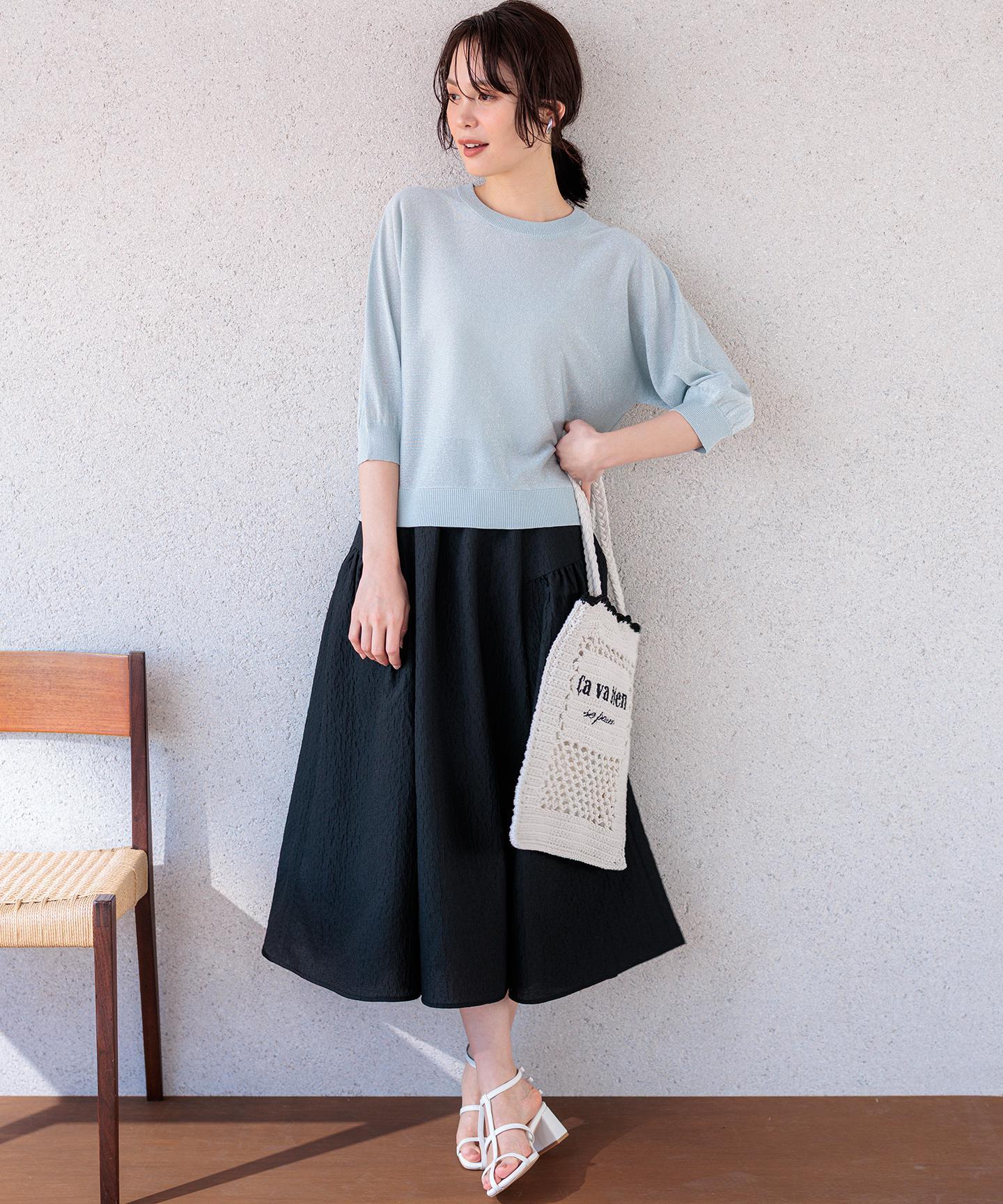 ■デザイン・切り替えギャザーデザインがアクセントになったふんわりとしたボリュームあるスカートです。・凹凸感あるジャカードの表情がトレンド感を増し、甘くなりすぎない大人な印象です。・後ウエストゴム使用でお腹回りも楽に着こなせます。・上品にもカジュアルにも着まわせるトレンドライクなスカートです。