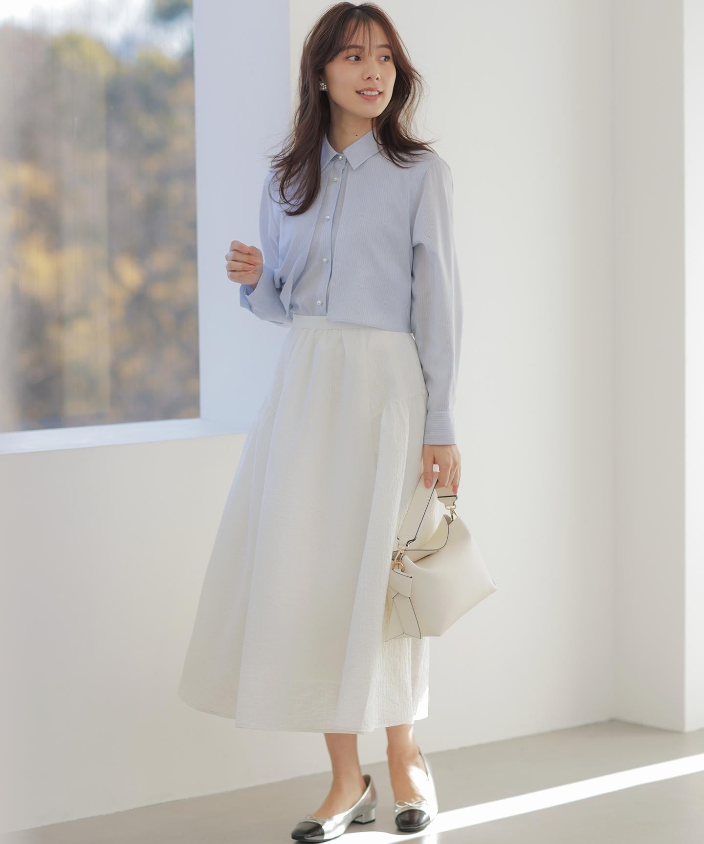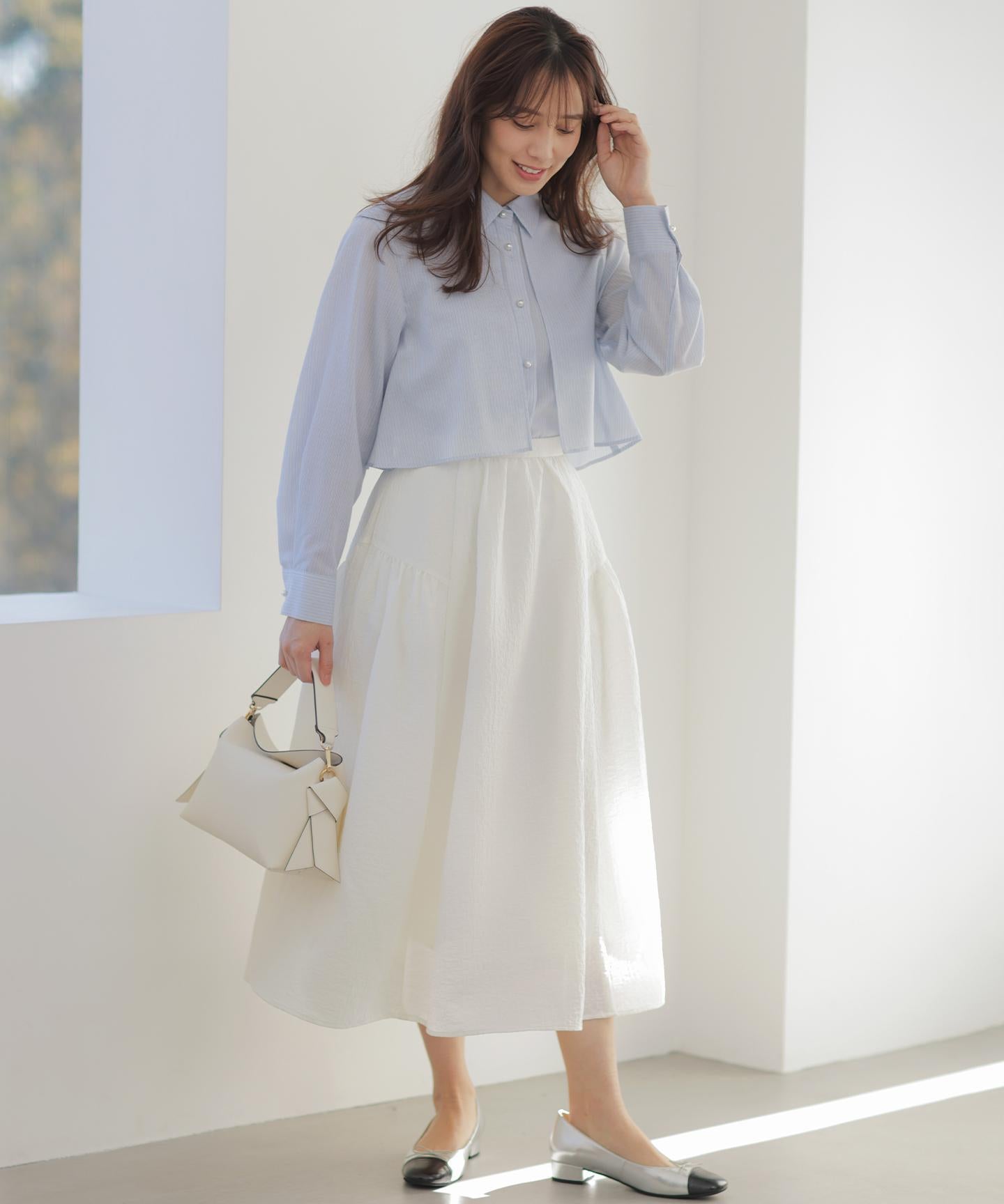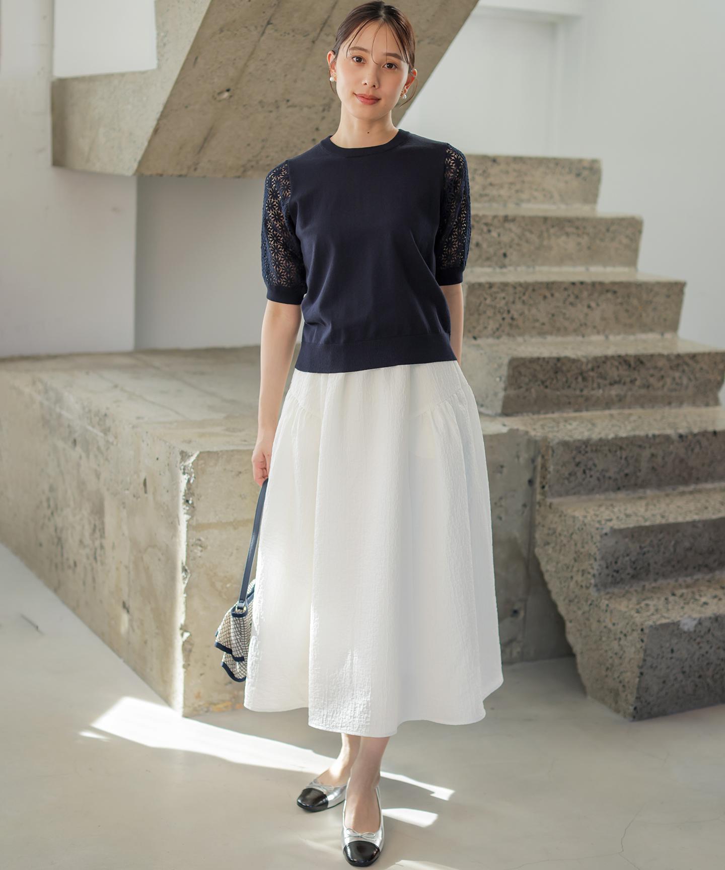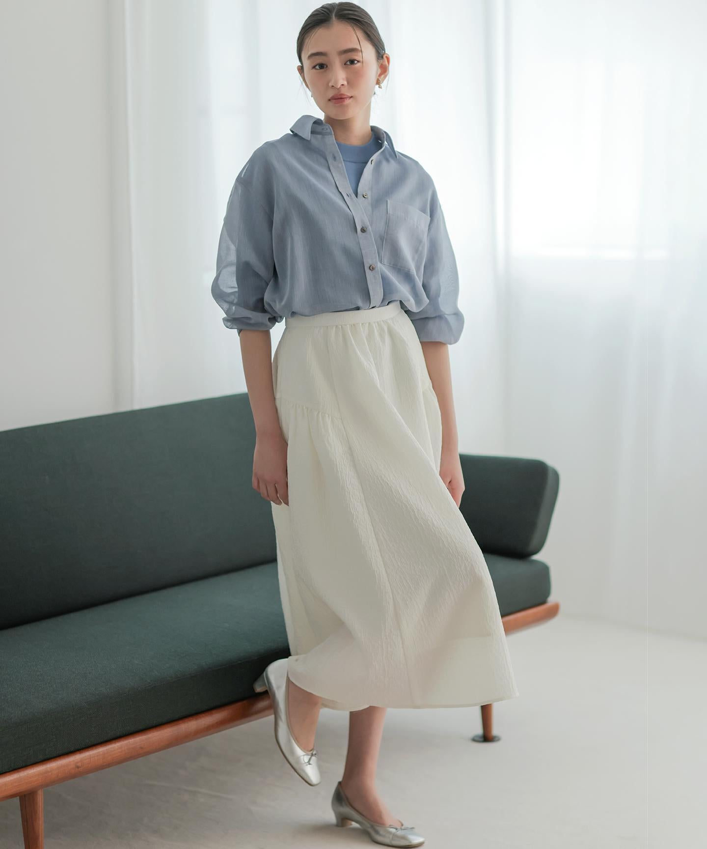 ■デザイン・切り替えギャザーデザインがアクセントになったふんわりとしたボリュームあるスカートです。・凹凸感あるジャカードの表情がトレンド感を増し、甘くなりすぎない大人な印象です。・後ウエストゴム使用でお腹回りも楽に着こなせます。・上品にもカジュアルにも着まわせるトレンドライクなスカートです。